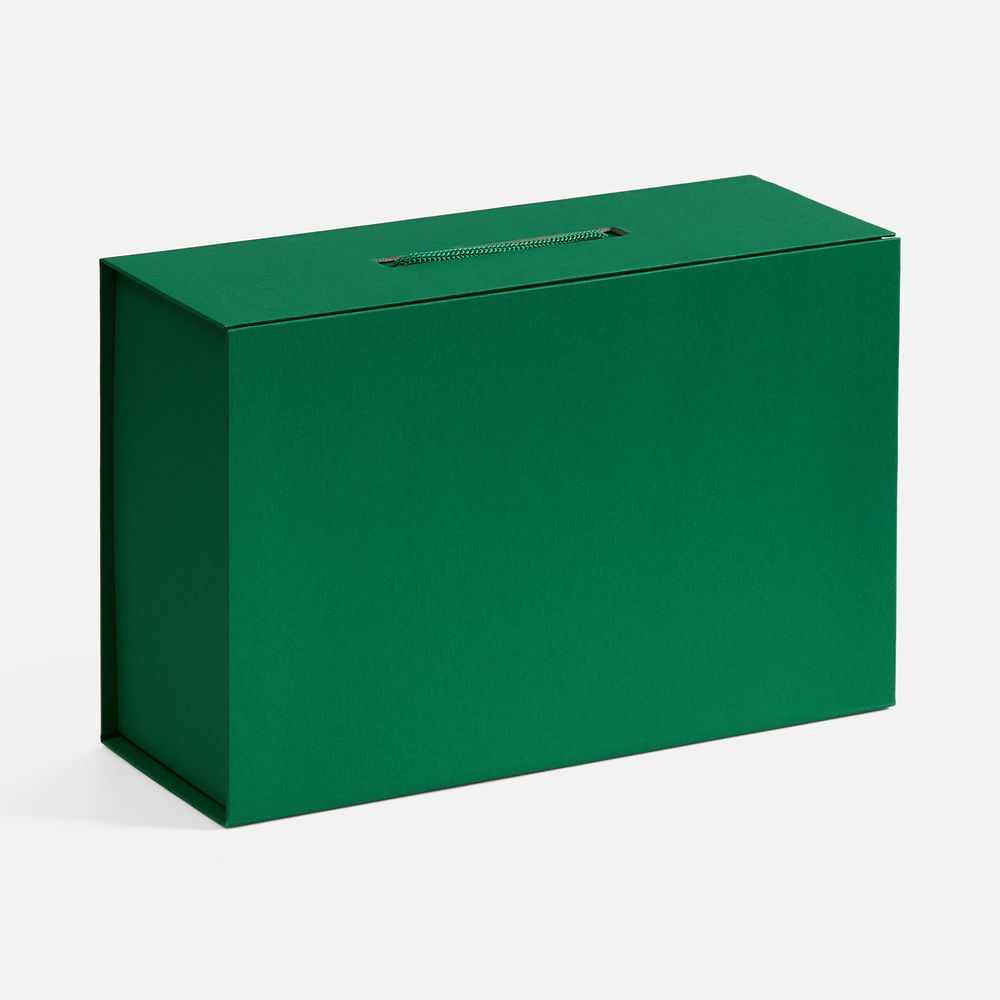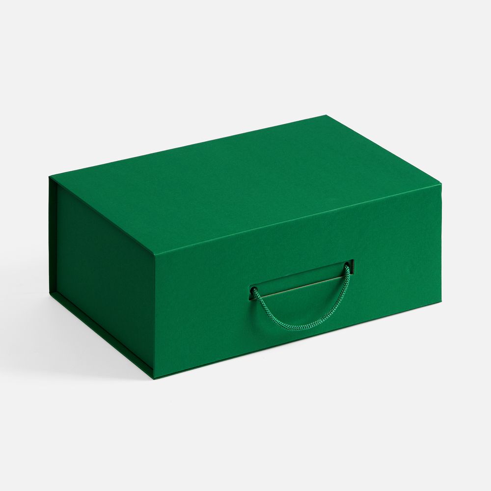 Коробка выполнена из переплетного картона, кашированного дизайнерской бумагой Malmero, с крышкой на магните. Выдерживает вес до 1,5 кг. Для большей нагрузки рекомендуется провести тест самостоятельно. Длина ручки 35 см.