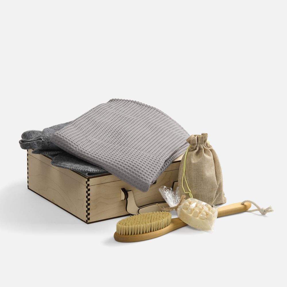 кейс - дерево, береза; банная шапка, коврик, рукавица - шерсть, 40%, полиэфир 60%; войлок; килт - хлопок 100%, плотность 240 г/м²; щетка - дерево, карельская береза; щетина кабана средней жесткости