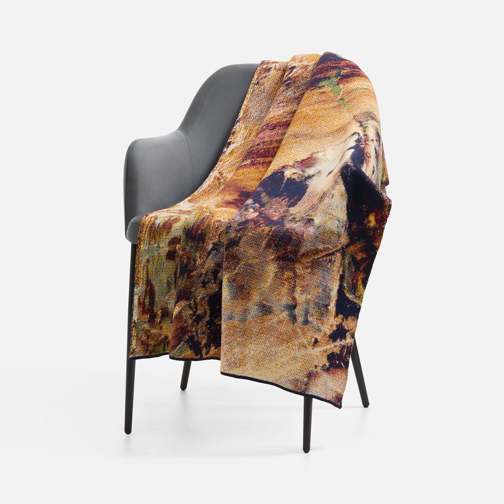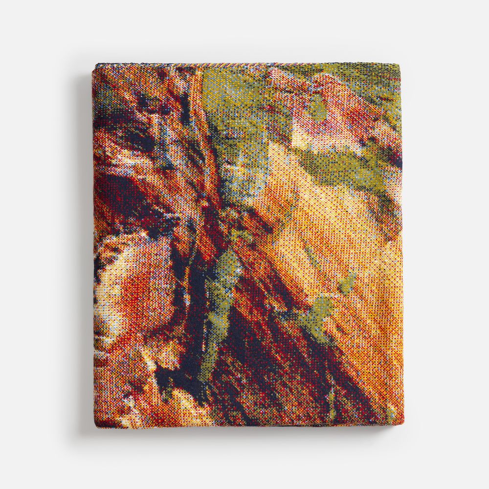 Плед с вывязанным логотипом и индивидуальным рисунком в фирменной цветовой гамме. Выполняется на машине 12 класса с увеличенным количеством нитеводителей и уменьшенным размером иглы, что позволяет делать более мелкую петлю и использовать в вязании до 8 цветов пряжи в одном ряду для создания плавных градиентов. Теперь любой плед можно превратить в настоящую картину и изобразить на ней все, что захочется, с почти фотографической точностью.