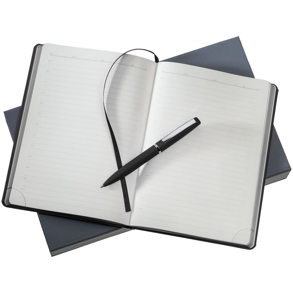 ежедневник - искусственная кожа; ручка - металл; покрытие софт-тач; коробка - картон