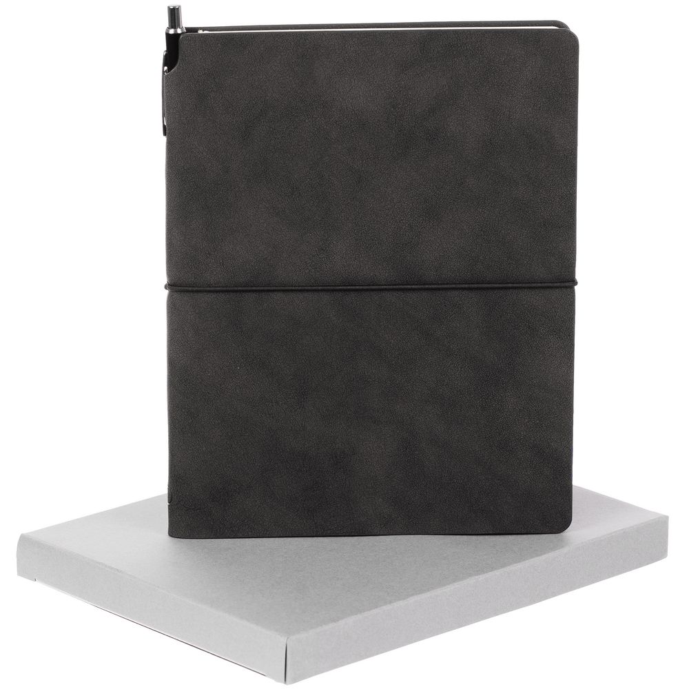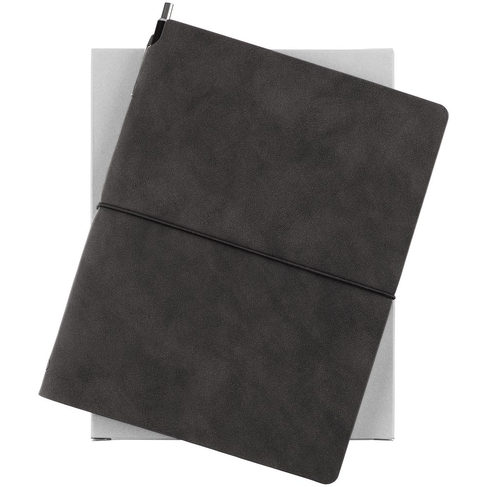 Ежедневник из искусственного материала, напоминающего замшу, и изящная ручка, которая удобно прячется за обложку ежедневника.