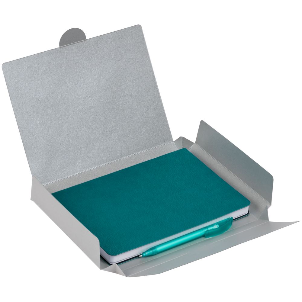 Недатированный ежедневник с гибкой обложкой из фактурного материала La Fite и металлическим шильдом на ляссе и ручка в тон, упакованные в подарочную коробку из дизайнерского картона.