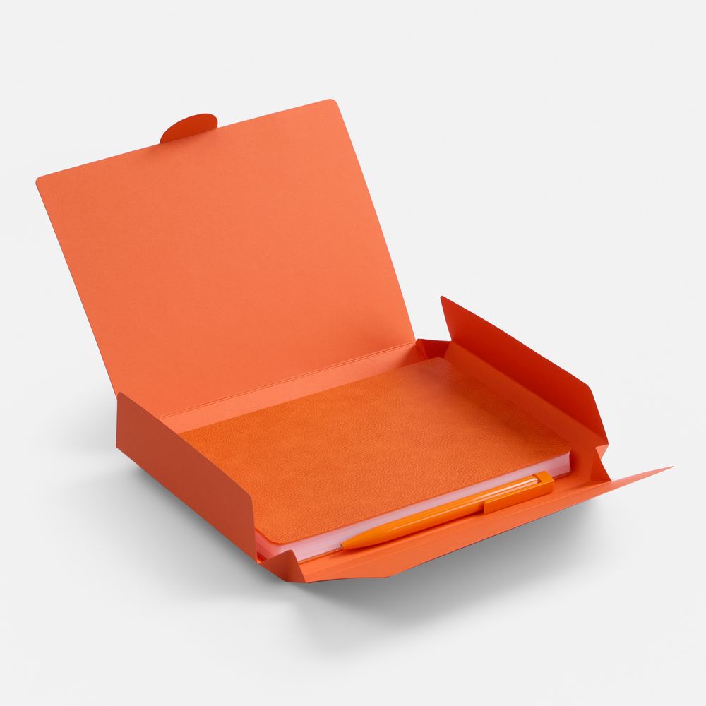 Недатированный ежедневник с гибкой обложкой из фактурного материала La Fite и металлическим шильдом на ляссе и ручка в тон, упакованные в подарочную коробку из дизайнерского картона.