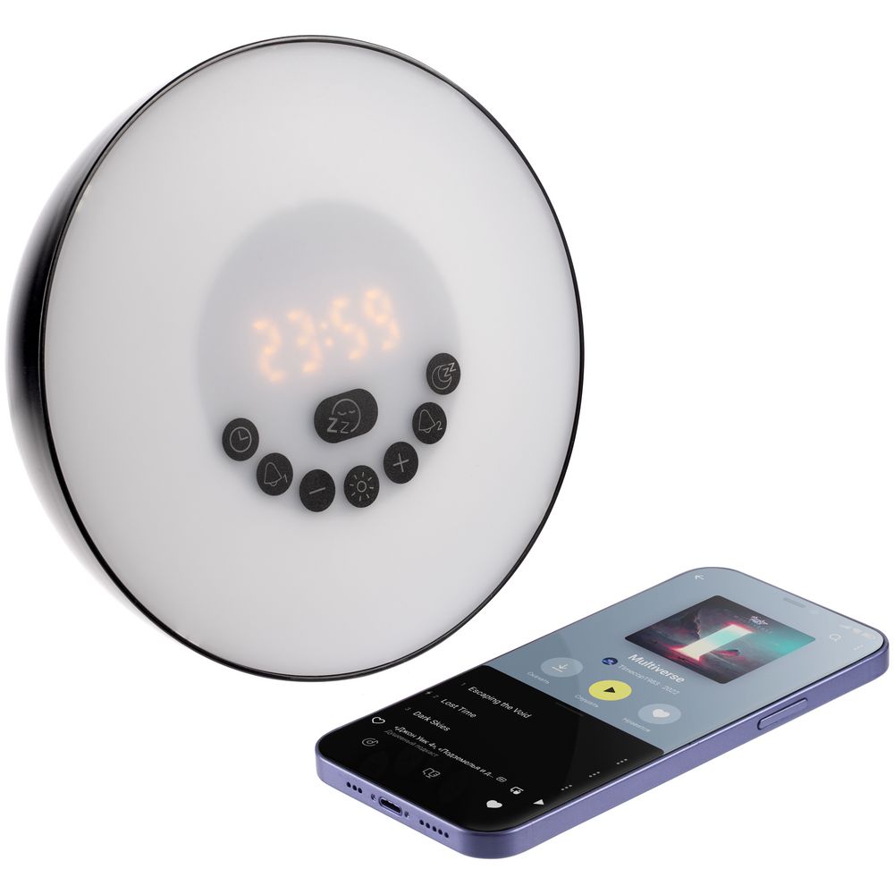 Лампа активируется за некоторое время до настроенного будильника и постепенно увеличивает яркость вплоть до момента, когда вы планируете окончательно проснуться. Эффект мягкого пробуждения можно дополнить звуками природы: шумом волн или пением птиц.