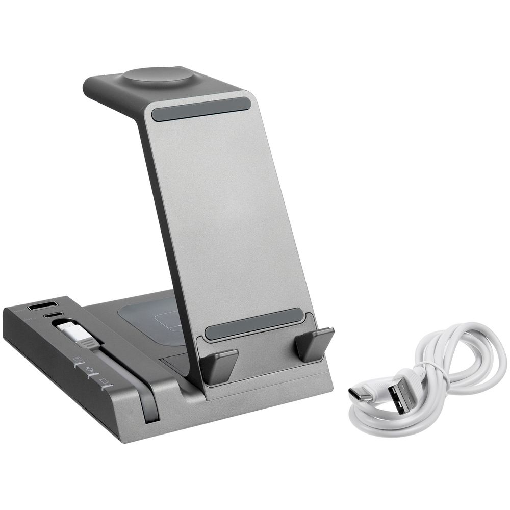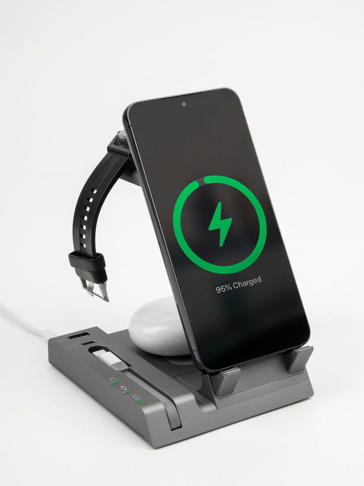Зарядная станция Tres высшего уровня сложности позволяет заряжать до 5 гаджетов одновременно: телефон, часы Apple Watch 2–8, наушники с поддержкой протокола беспроводной зарядки Quick Charge и еще 2 устройства через кабели с разъемами USB-А и Type-C.