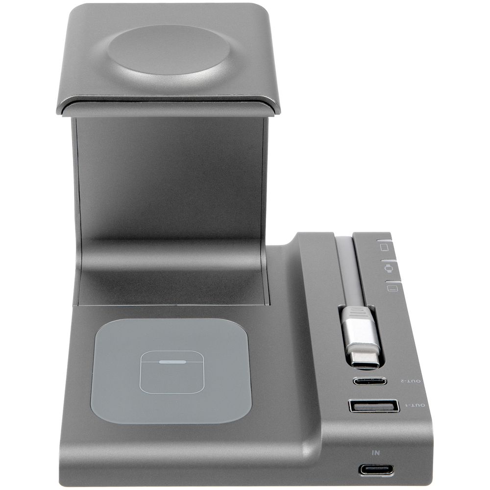 Выходная мощность беспроводного заряда при использовании зарядного устройства QC 2.0–3.0 (25–30 Вт) с параметрами зарядки 5 В, 3 А; 9 B, 2,4 A; 12 В, 2A: — основная область: 15 Вт, смартфон небольшого размера можно расположить горизонтально — область для наушников на основании станции: до 5 Вт — область для Apple Watch (2–8): до 3 Вт — выходы USB-A и Type-C (2 штуки): автораспределение по 5 В, 1 А на разъем при полной нагрузке