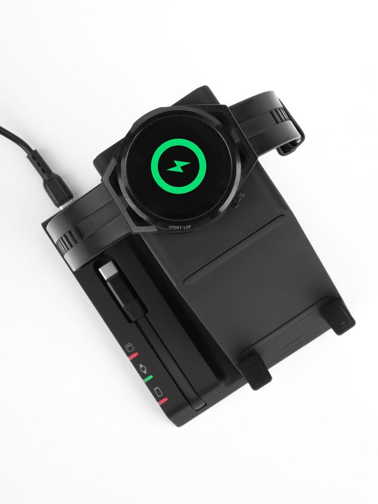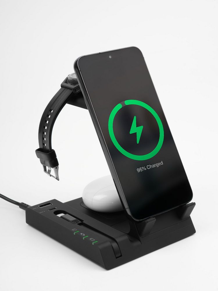 Зарядная станция Tres высшего уровня сложности позволяет заряжать до 5 гаджетов одновременно: телефон, часы Apple Watch 2–8, наушники с поддержкой протокола беспроводной зарядки Quick Charge и еще 2 устройства через кабели с разъемами USB-А и Type-C.