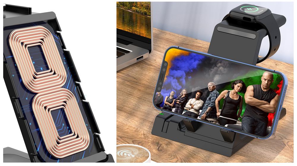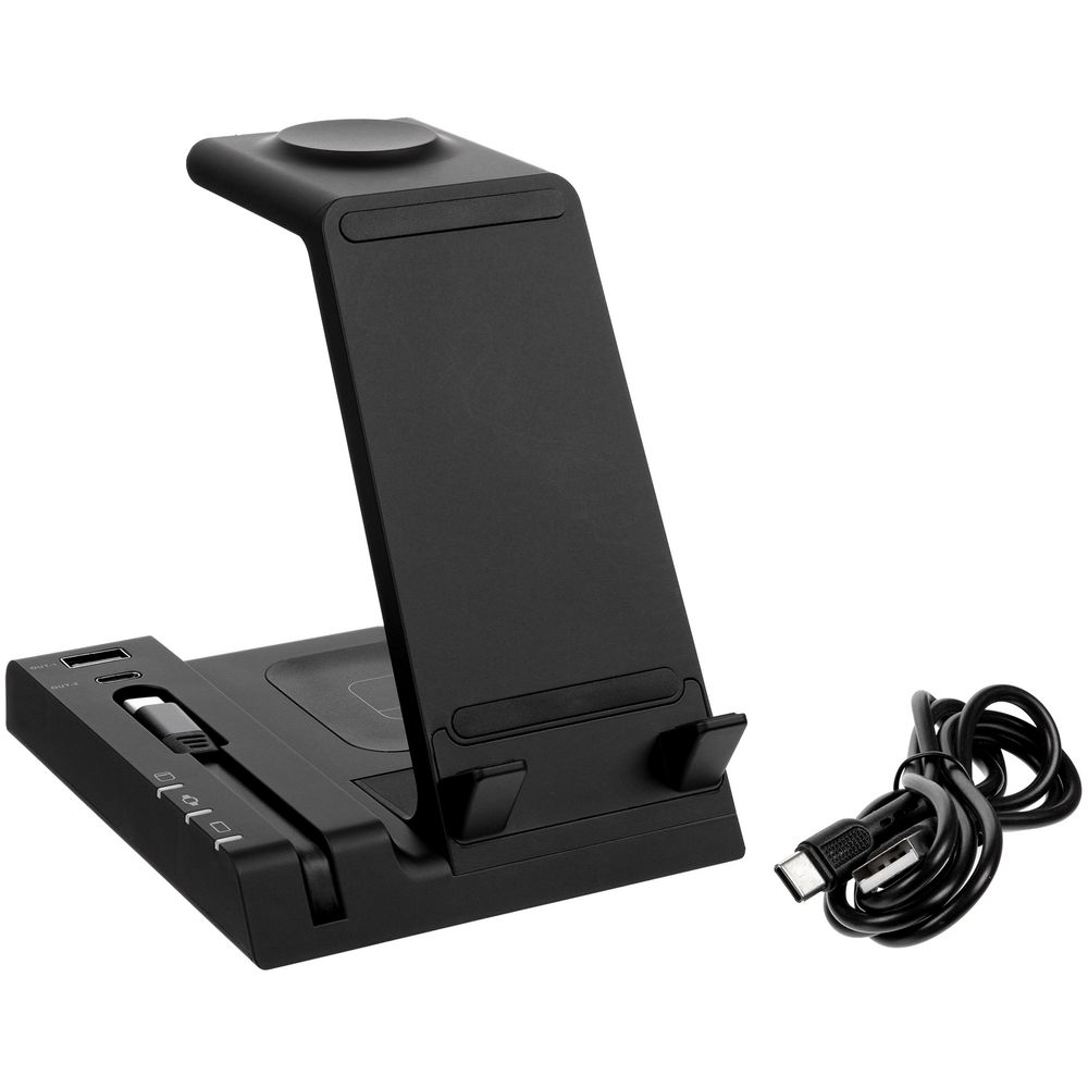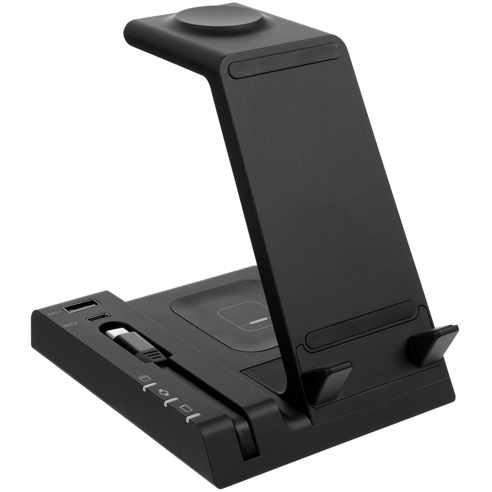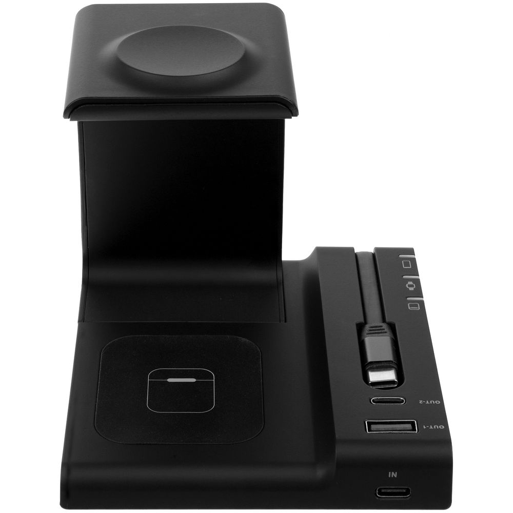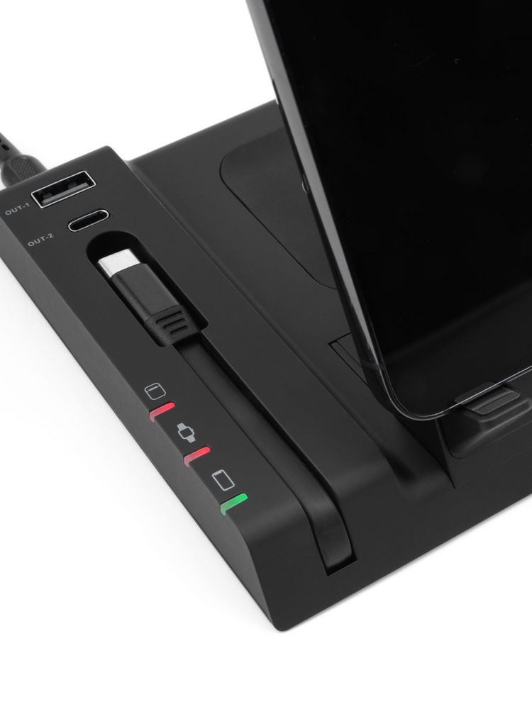 Выходная мощность беспроводного заряда при использовании зарядного устройства QC 2.0–3.0 (25–30 Вт) с параметрами зарядки 5 В, 3 А; 9 B, 2,4 A; 12 В, 2A: — основная область: 15 Вт, смартфон небольшого размера можно расположить горизонтально — область для наушников на основании станции: до 5 Вт — область для Apple Watch (2–8): до 3 Вт — выходы USB-A и Type-C (2 штуки): автораспределение по 5 В, 1 А на разъем при полной нагрузке