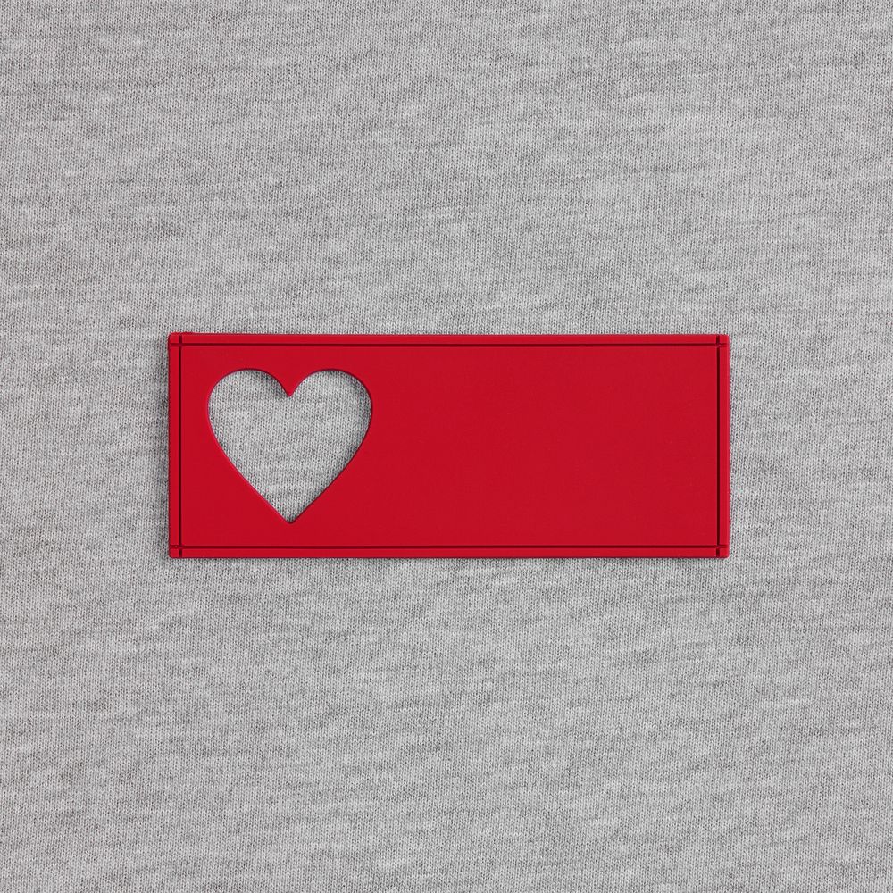 сделать нанесение на изделии, поверх которого нашить лейбл так, чтобы вырубка стала частью целостного и уникального дизайна.