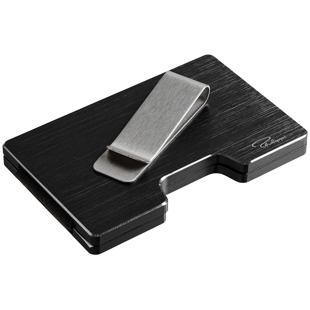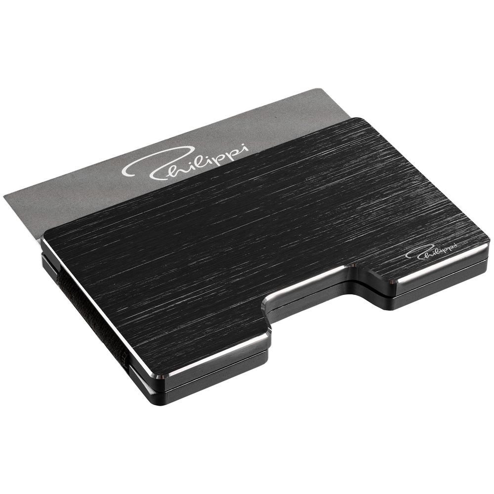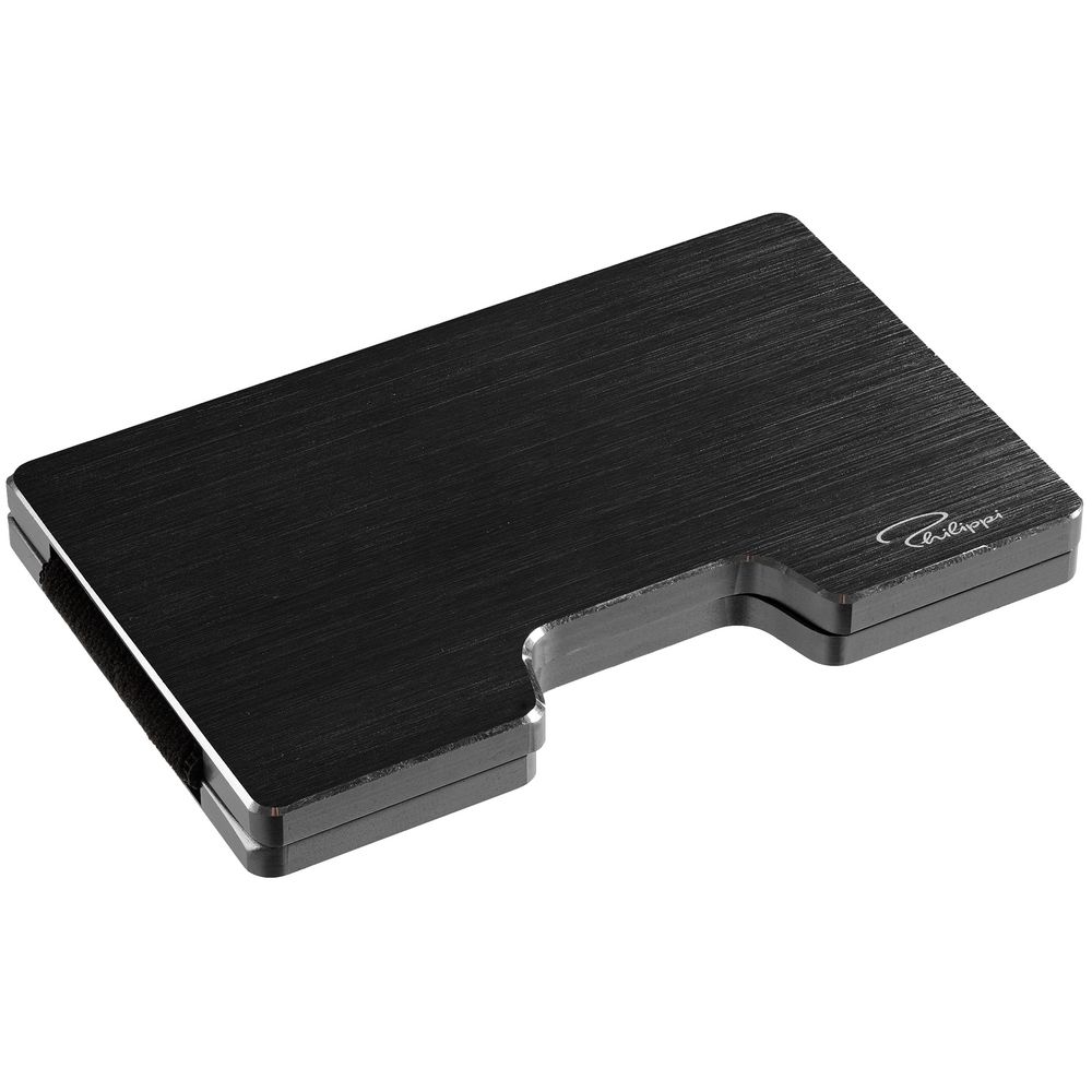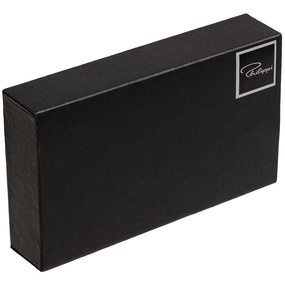 Две части футляра с RFID-защитой соединены резинкой, что позволяет использовать его для большого количества карт. Футляр вмещает до 25 пластиковых карт или до 70 визиток. Зажим для купюр можно закрепить на футляре или использовать отдельно. Упакован в фирменную черную коробку Philippi с шубером.