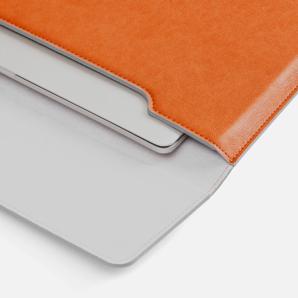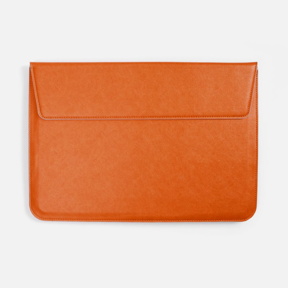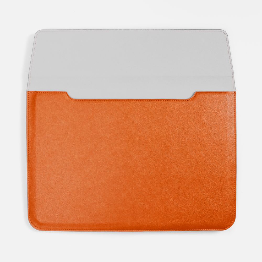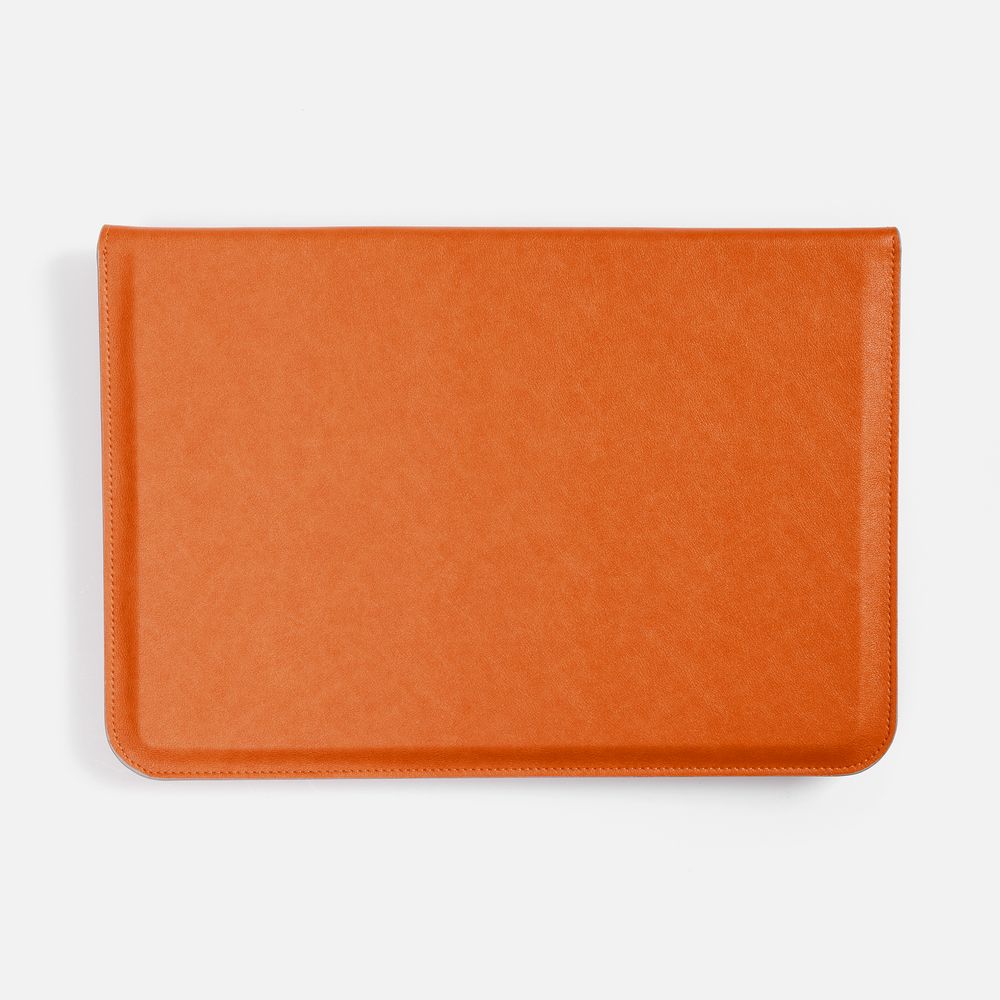 Чехол для ноутбука с диагональю до 15,6 выполнен из материала Petrus, оранжевого цвета, дополнен окрашенным срезом края серого цвета. Можно использовать в качестве папки для бумаг. Клапан на магните.