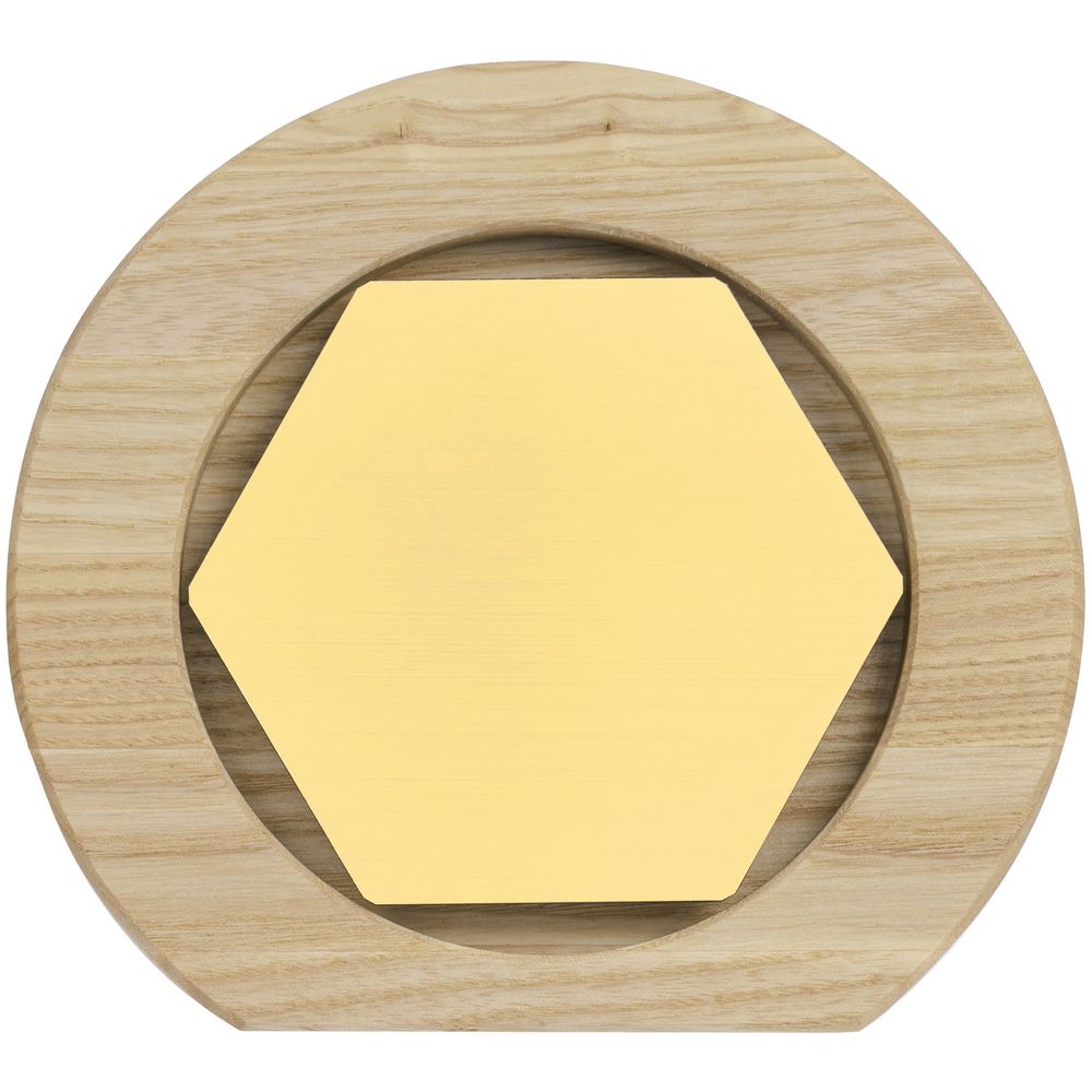 Красивое решение подойдет как для команды, так и для отдельных выдающихся личностей. Вставка с шестигранником из зеркального пластика на деревянной основе крепится на приподнятое основание внутри стелы, что создает объем и многослойность награды. На вставке предусмотрен клеевой слой для крепления после нанесения.