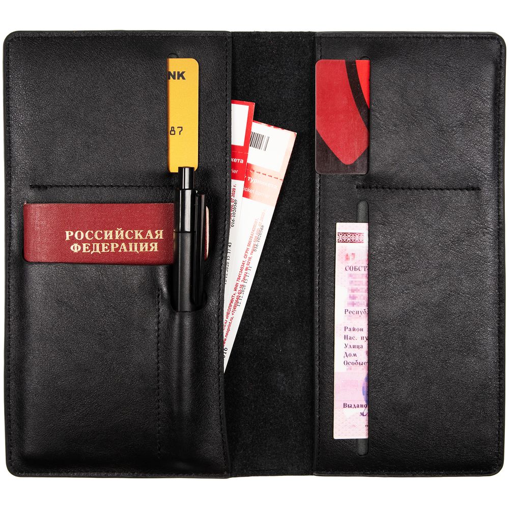 • Два больших отделения для купюр, страховок и билетов