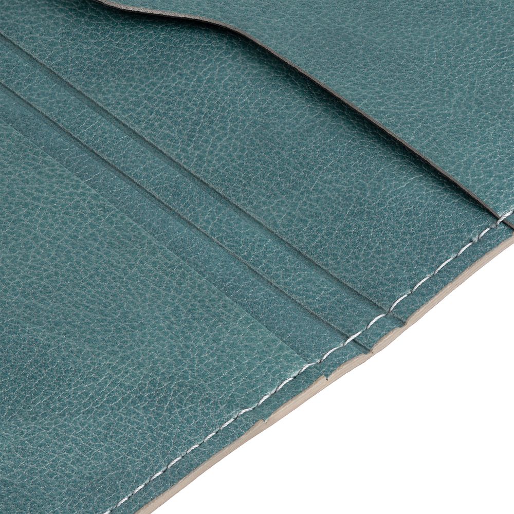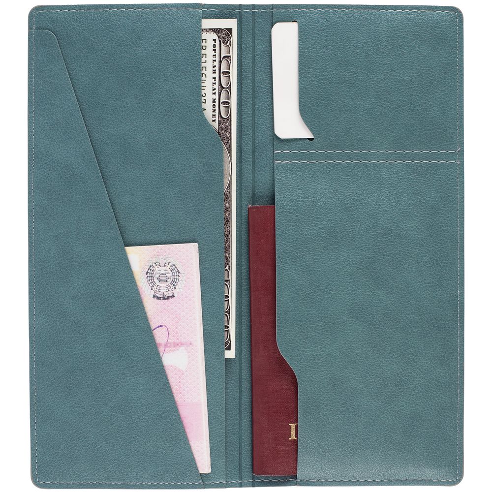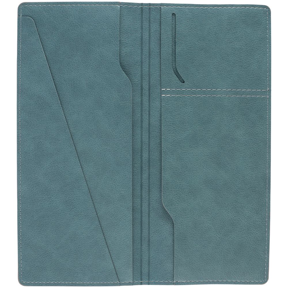 Органайзер выполнен из материала Petrus, голубой JJ, дополнен окрашенным срезом края серого цвета. Имеет 5 отделений: для билетов, паспорта, визиток или кредитных карт.