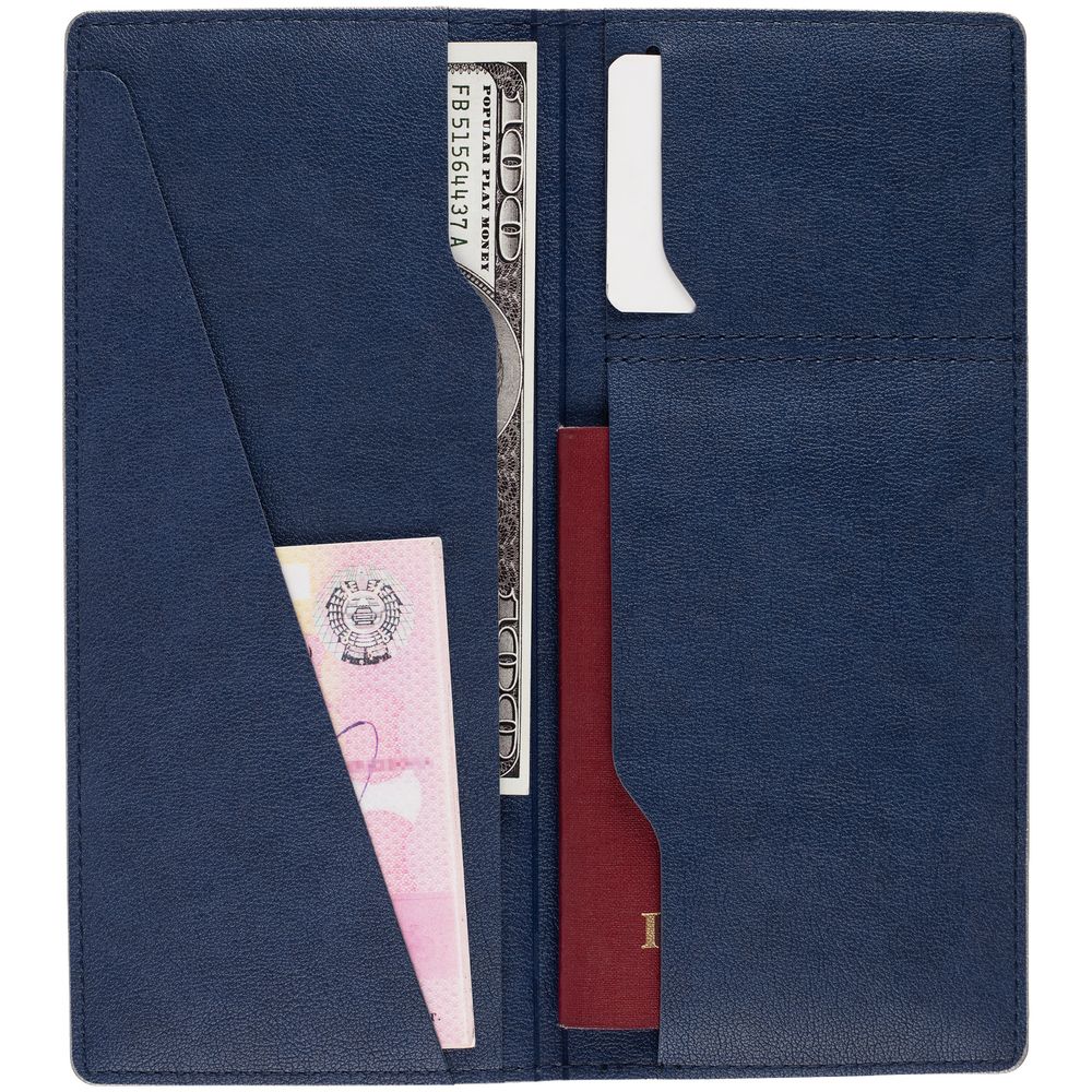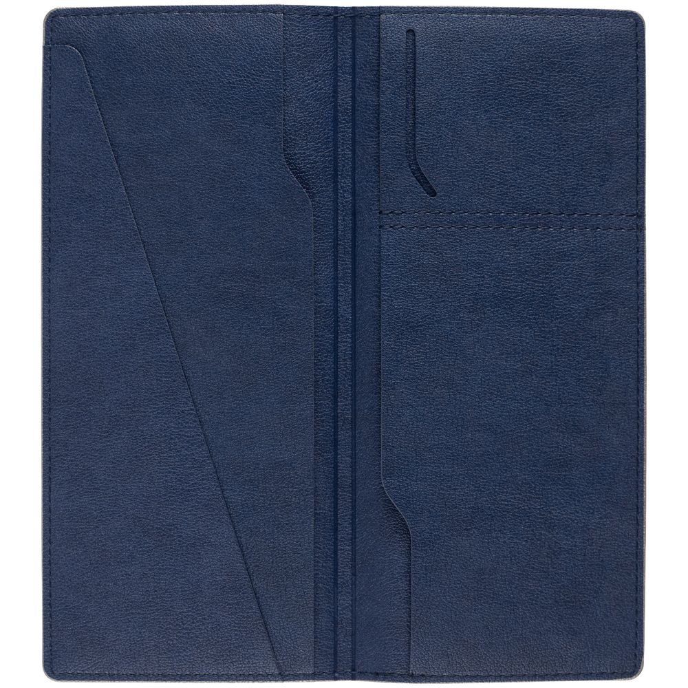 Органайзер выполнен из материала Petrus, синий НН, дополнен окрашенным срезом края серого цвета. Имеет 5 отделений: для билетов, паспорта, визиток или кредитных карт.