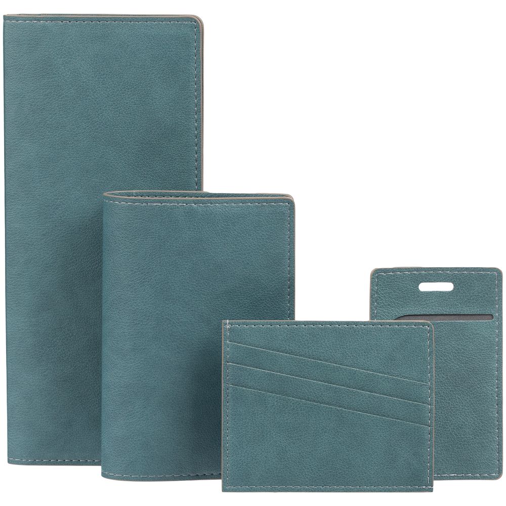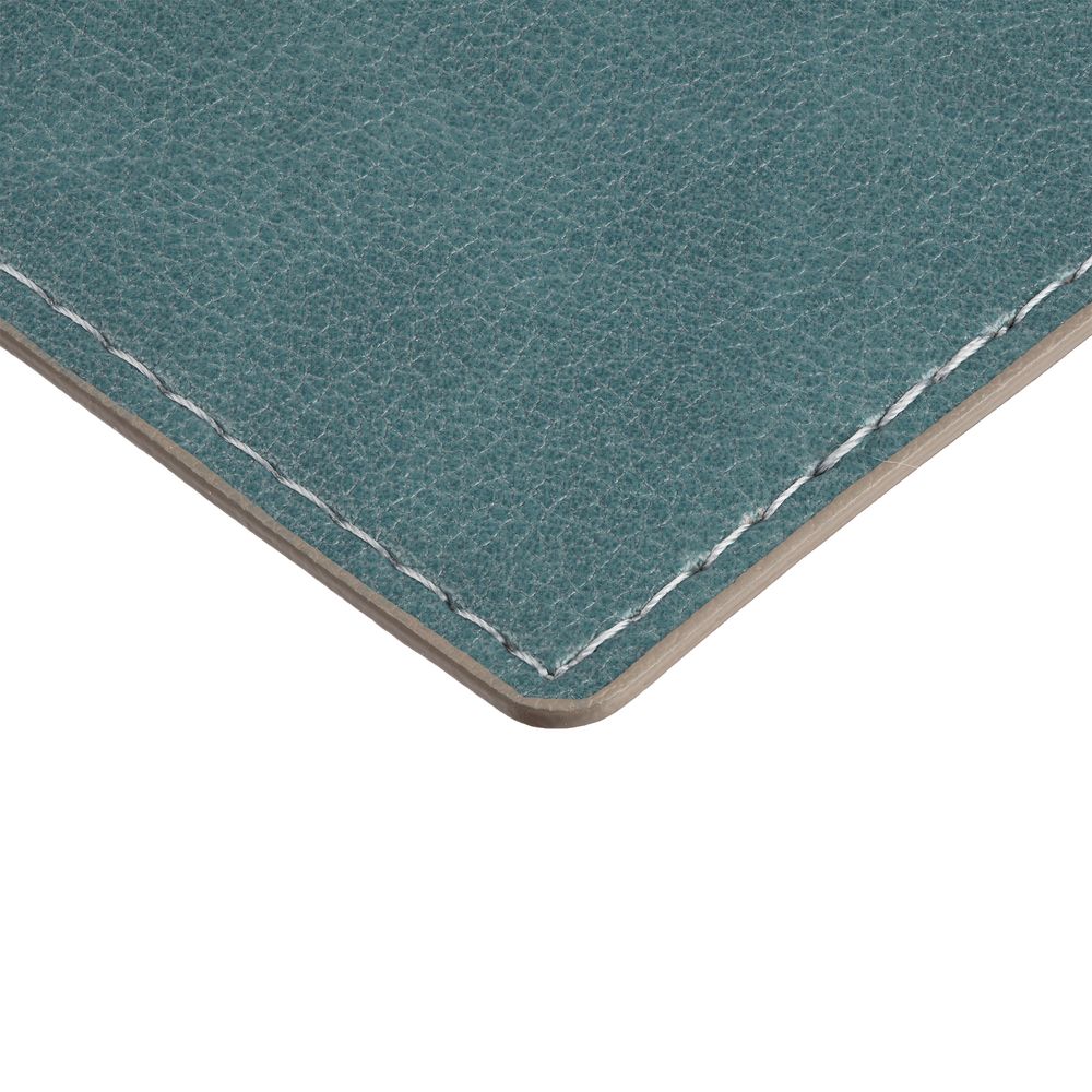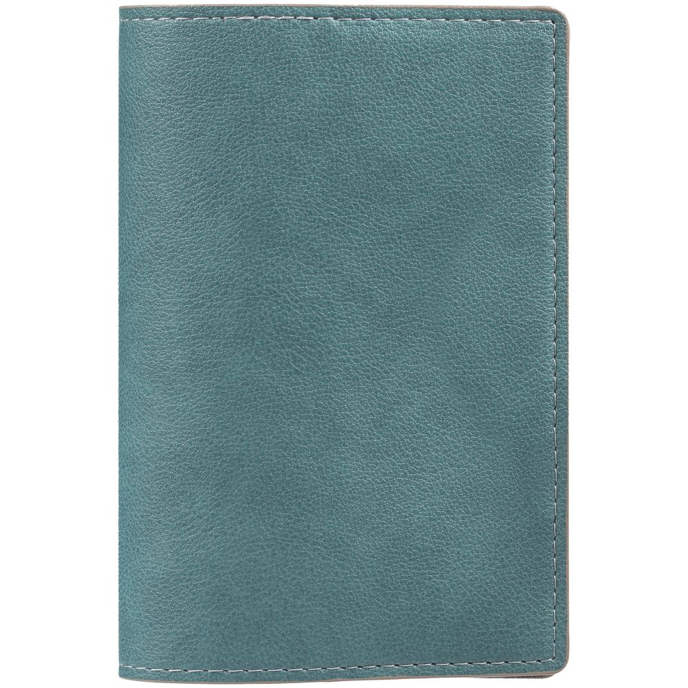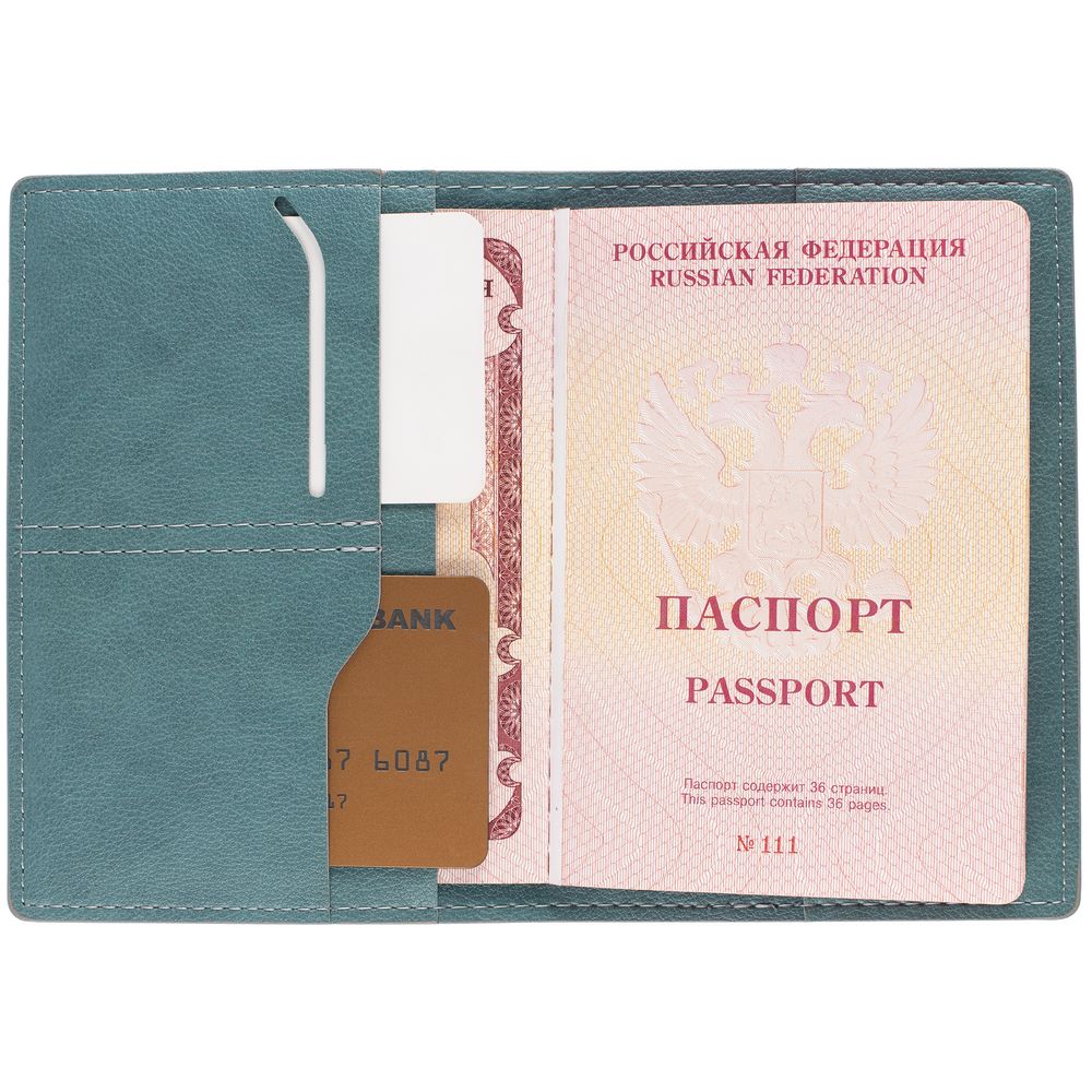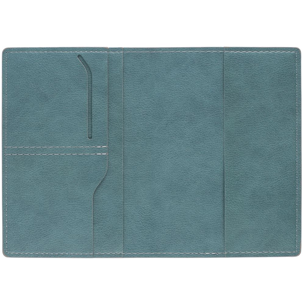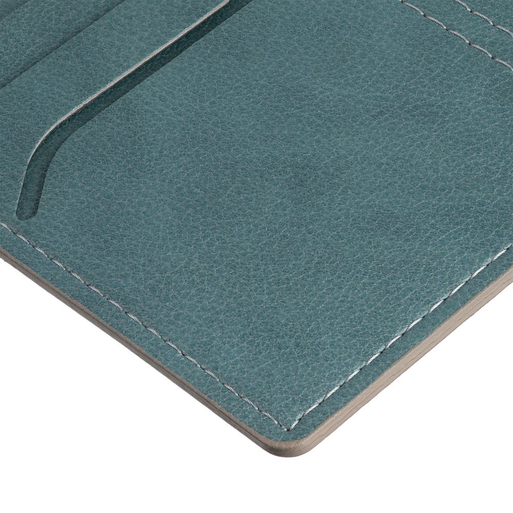 Обложка выполнена из материала Petrus, голубой JJ. Срез обложки окрашен в серый цвет. Имеет основное отделение для паспорта и 2 кармана для визиток или кредитных карт.
