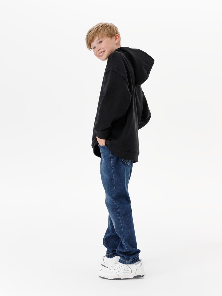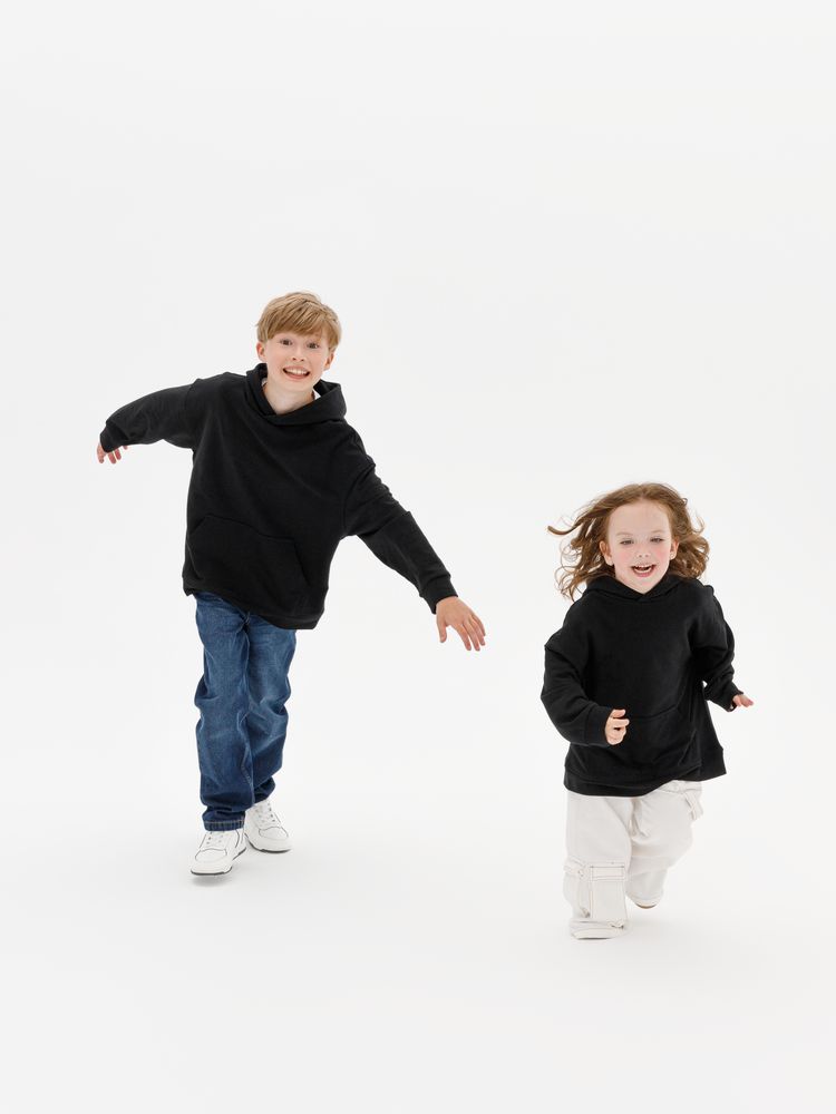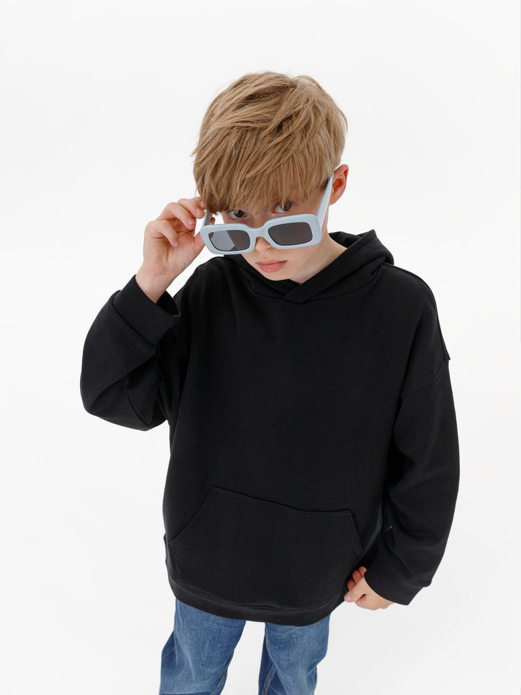 Детское худи оверсайз со спущенным плечом и карманом-кенгуру.
