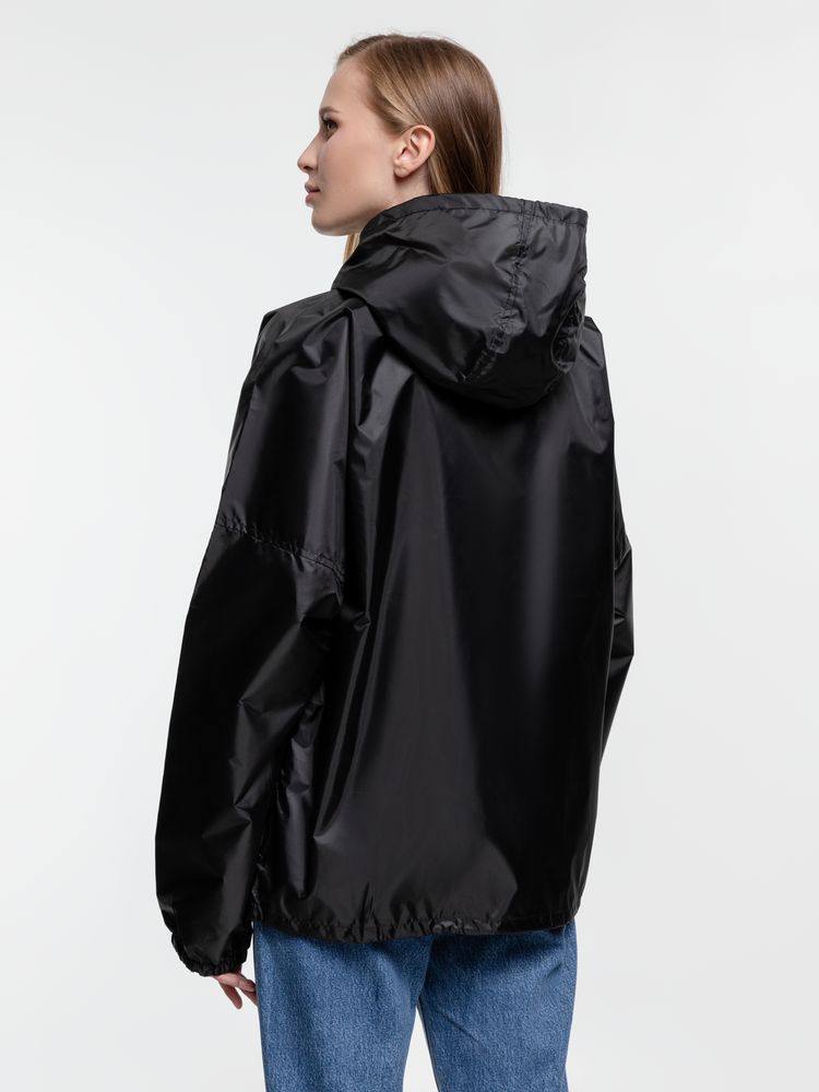 Укороченный дождевик свободного кроя из ткани таффета с влагозащитным покрытием. Складывается в мешочек — удобно брать с собой.