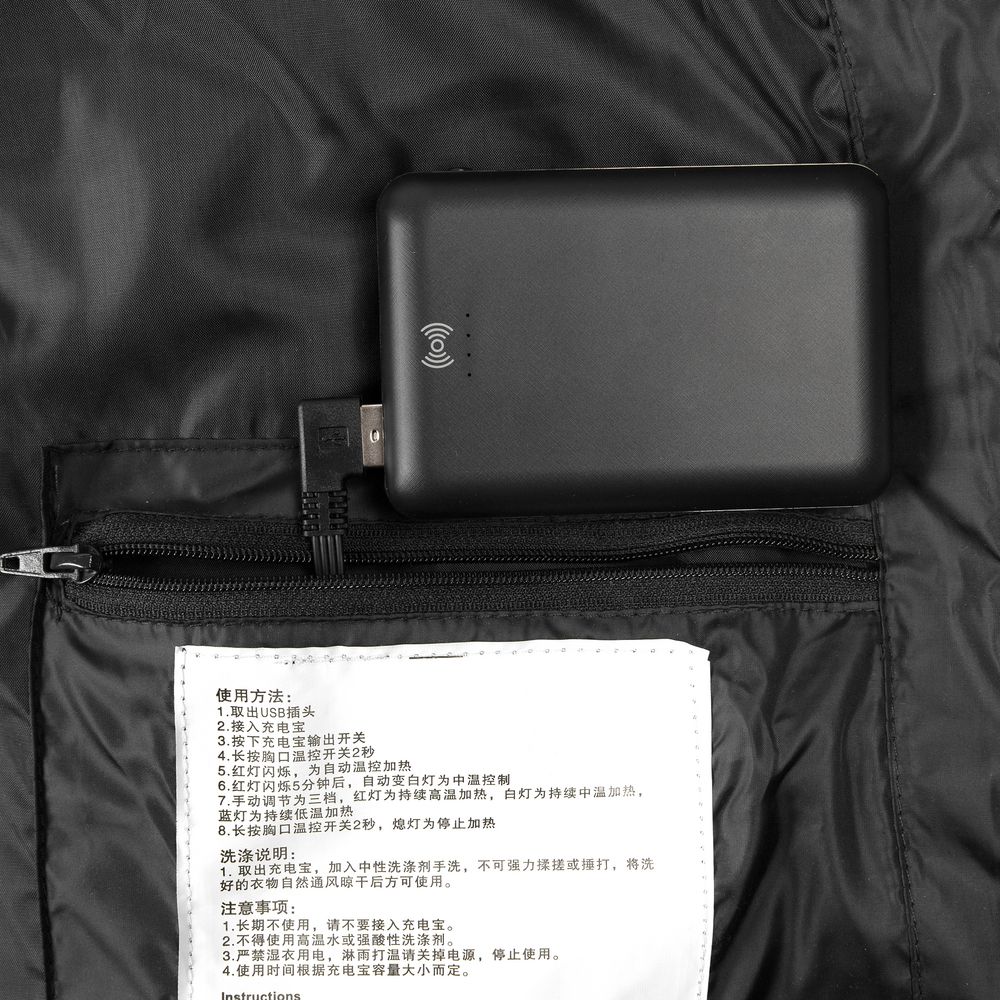 Жилет со встроенным нагревательным элементом из углеродного волокна с девятью зонами нагрева в области спины, шеи и живота. Работает от внешнего аккумулятора (в комплект не входит), подарит ощущение тепла и комфорта в любую погоду.