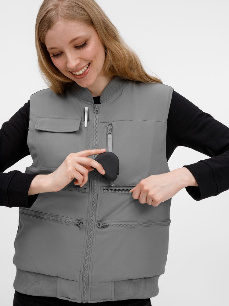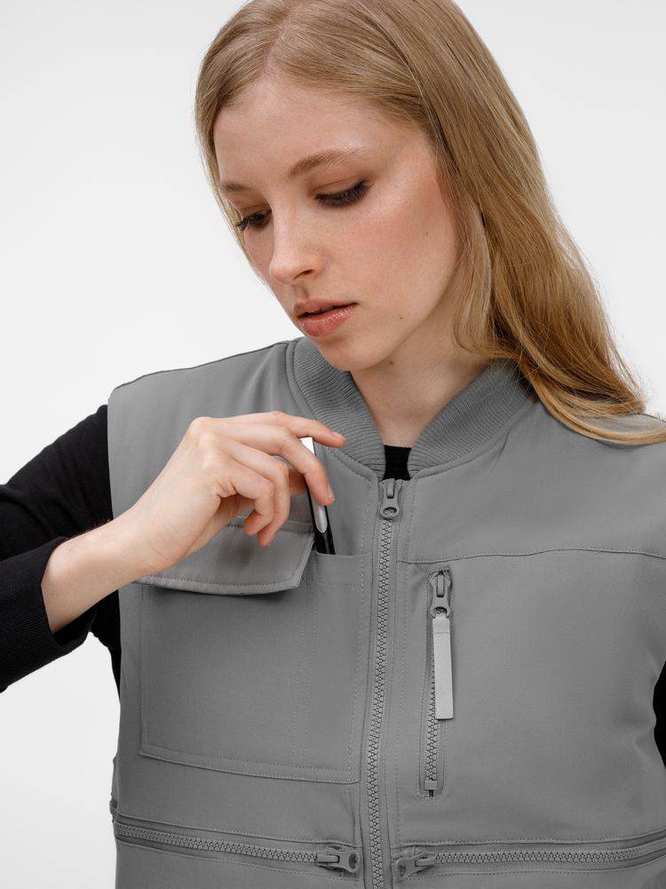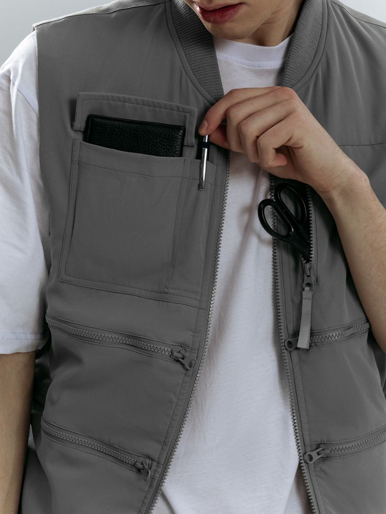 8 функциональных карманов, из них на передней части: 1 карман с клапаном для документов/рации, 1 карман для ручки, 5 вместительных на молнии, а так же 1 карман под планшет на молнии на спинке жилета