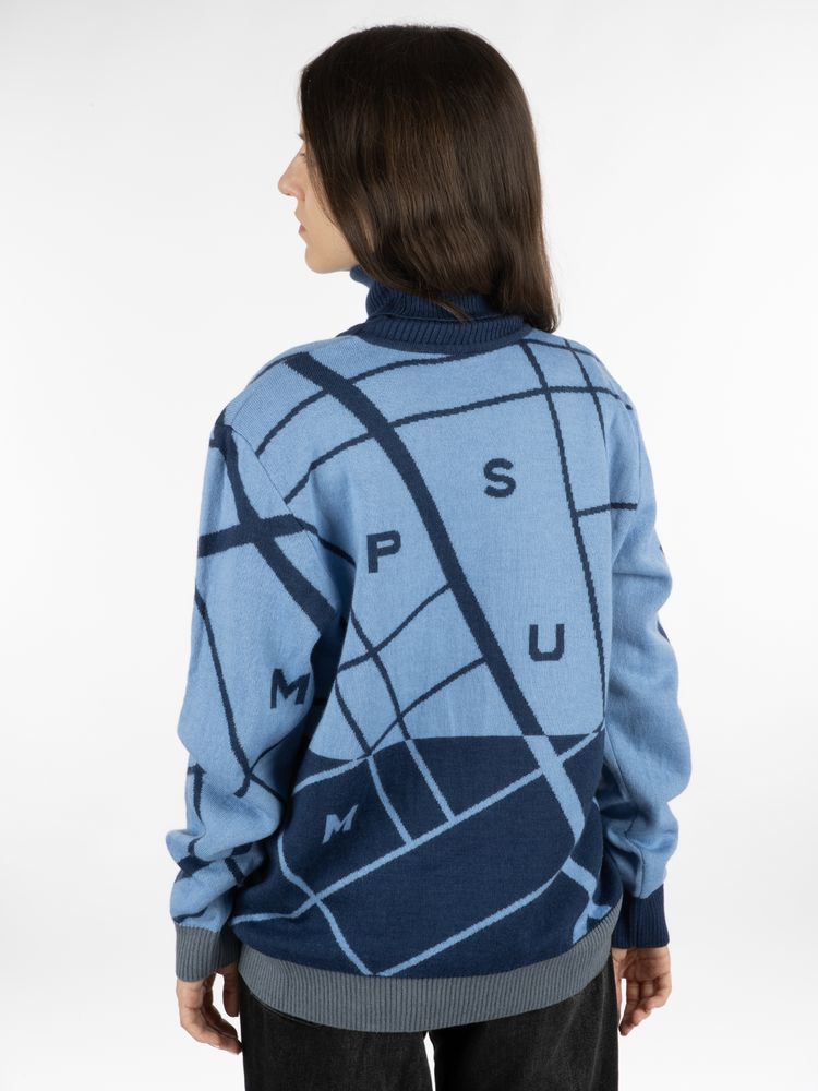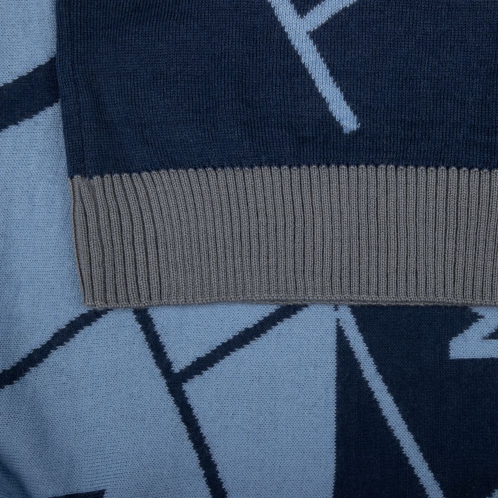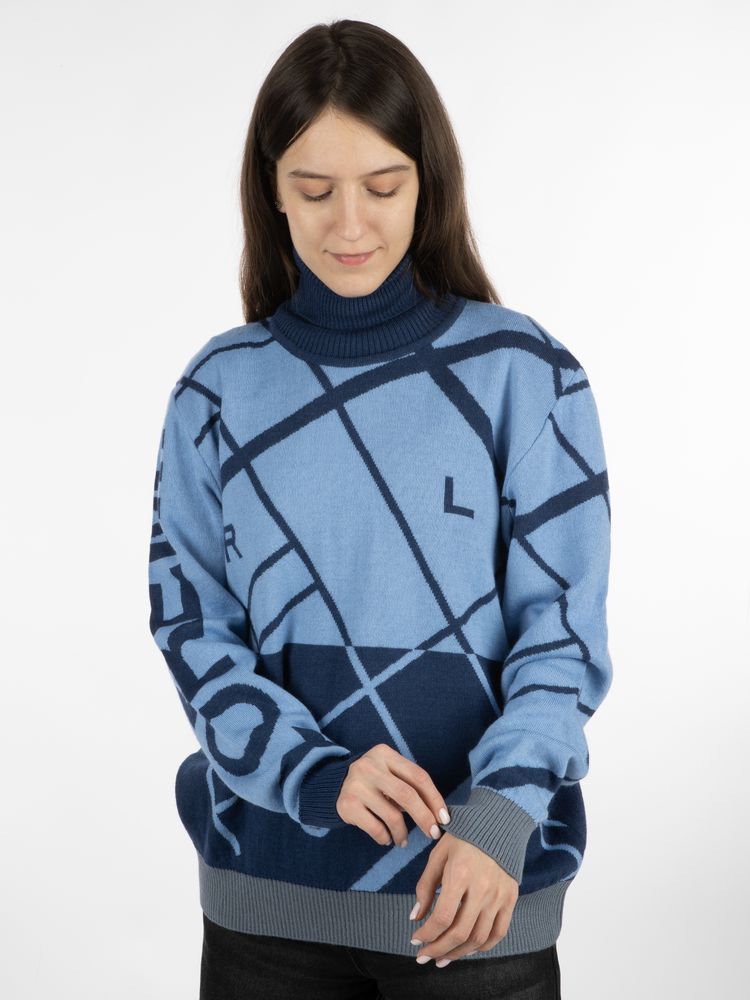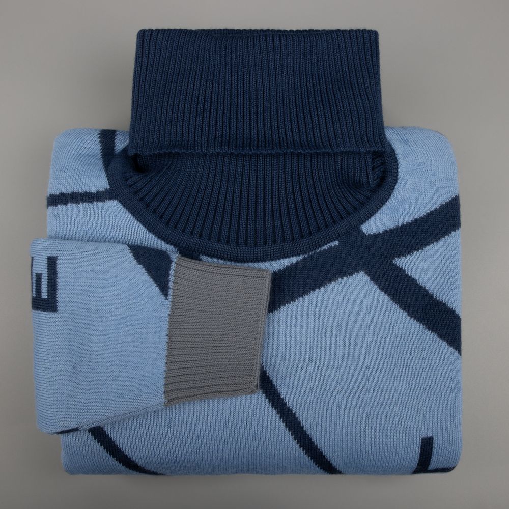 Свитер с вывязанным логотипом и индивидуальным рисунком в фирменной цветовой гамме.