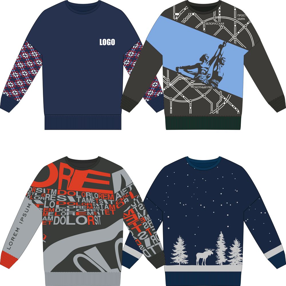 Свитер унисекс с вывязанным логотипом и индивидуальным рисунком в фирменной цветовой гамме.