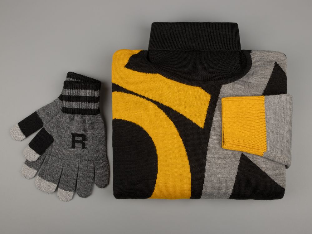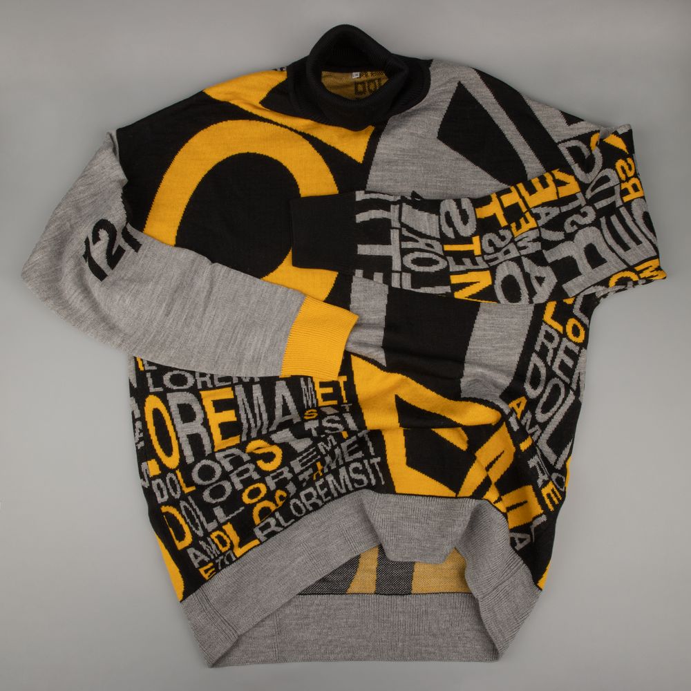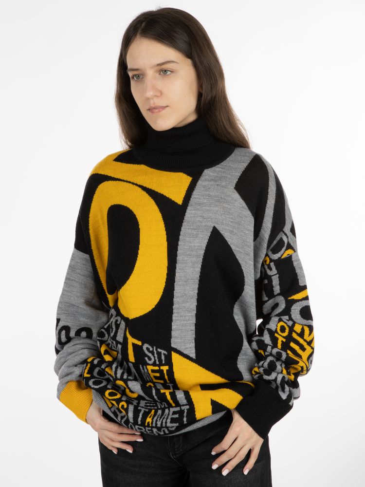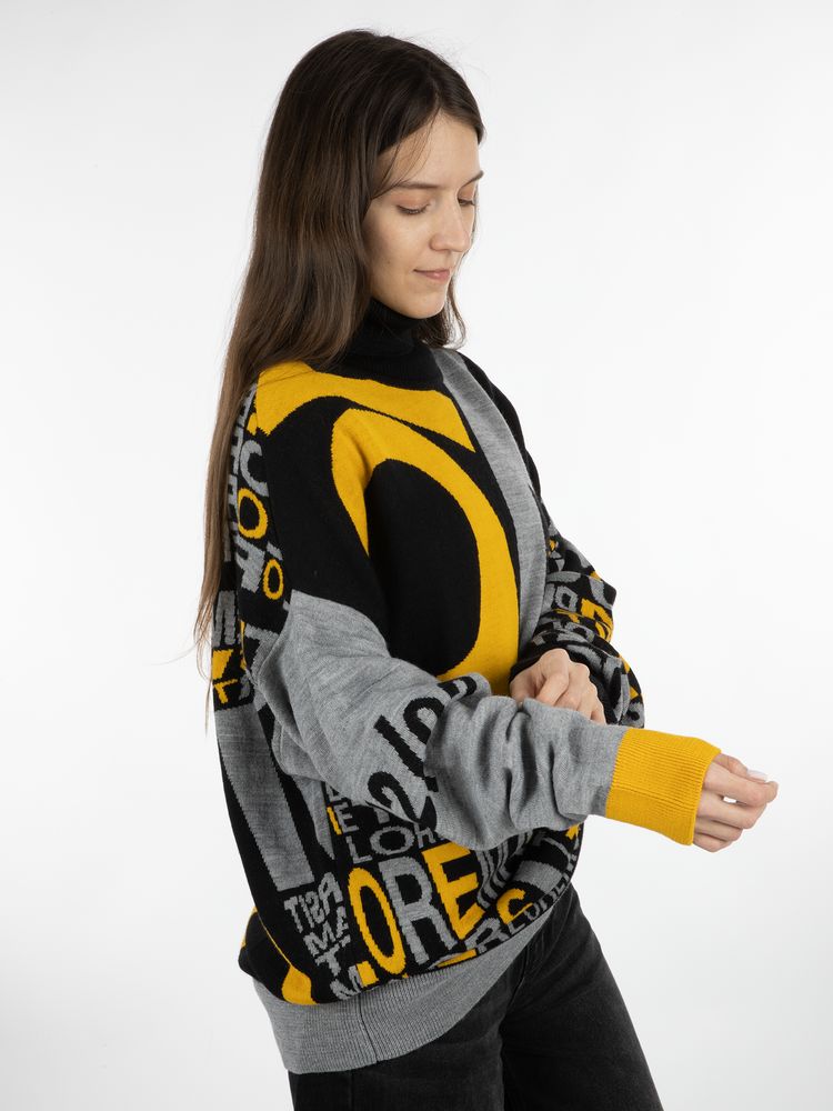 Свитер унисекс с вывязанным логотипом и индивидуальным рисунком в фирменной цветовой гамме.