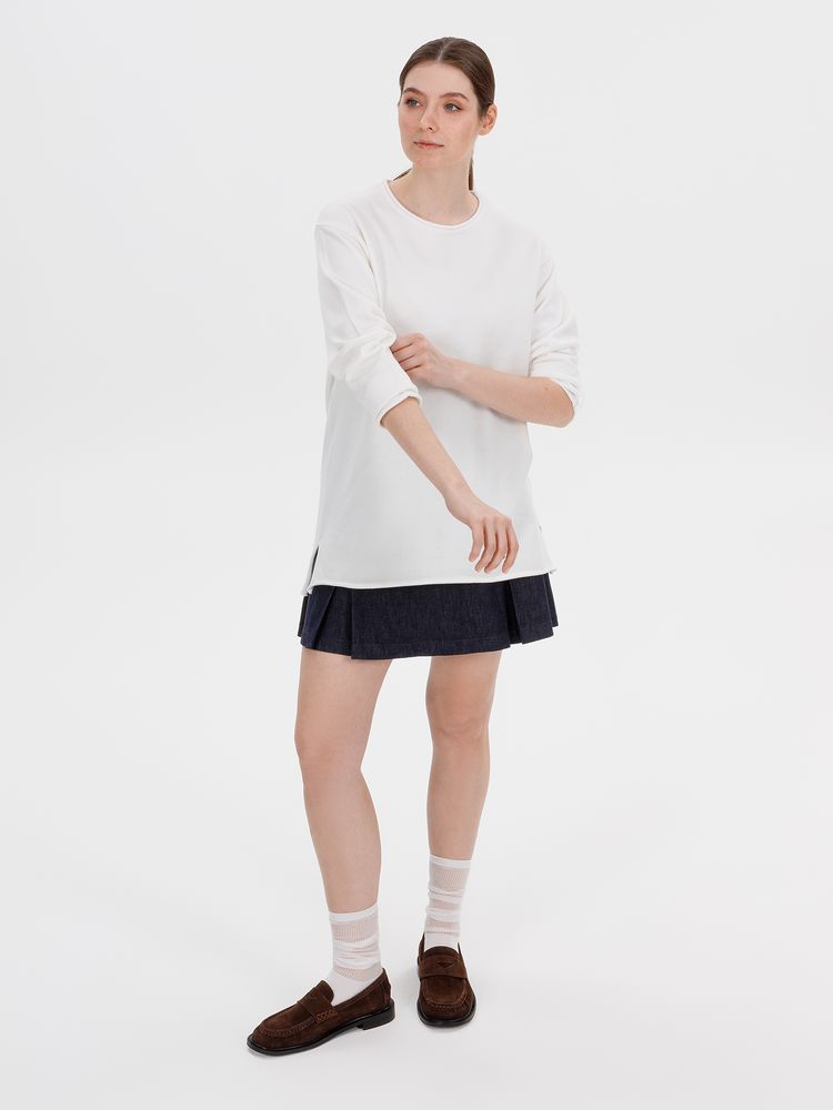 Siluetti. Силуэты уверенного будущего. Лонгслив Fuori средней плотности с широким воротом, спущенной линией плеча и свободно подворачивающимися краями по низу, на рукавах и вороте, которые добавляют модели еще большей расслабленности. Прозрачная бирка с логотипом бренда на рукаве не нарушает минималистичности образа.