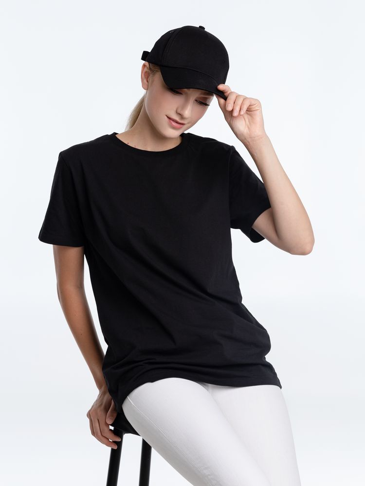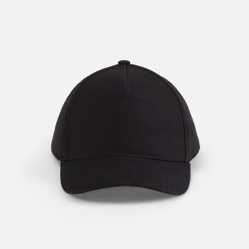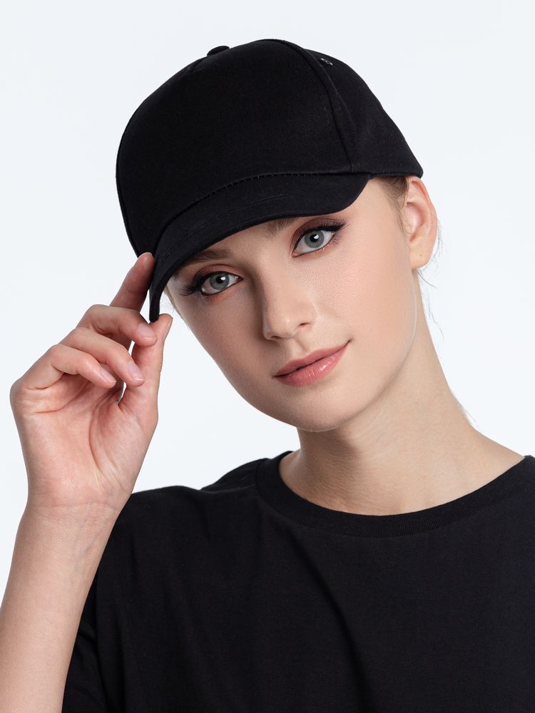 Модель бейсболки с 5-ю клиньями без лобового шва из плотного чесаного хлопка.
