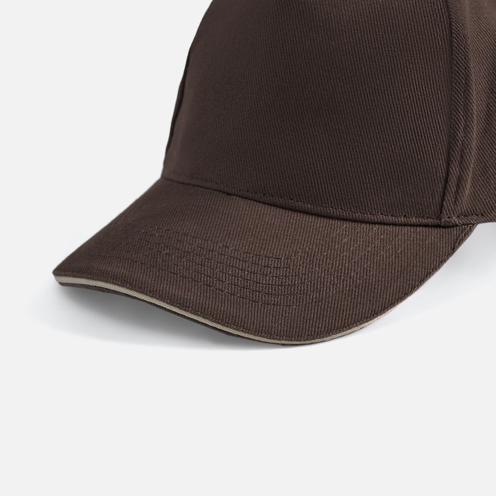 Модель бейсболки с 5-ю клиньями без лобового шва из плотного чесаного хлопка.