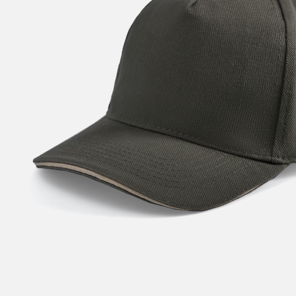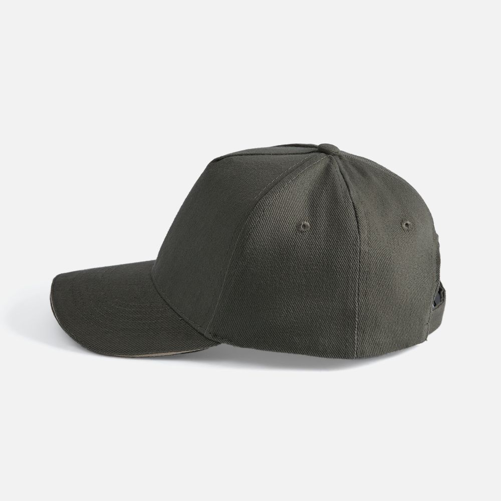 Модель бейсболки с 5-ю клиньями без лобового шва из плотного чесаного хлопка.