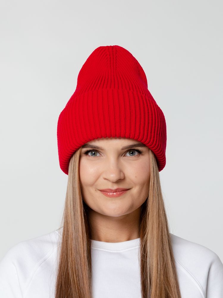 Удлиненная шапка объемной фактурной вязки с отворотом.