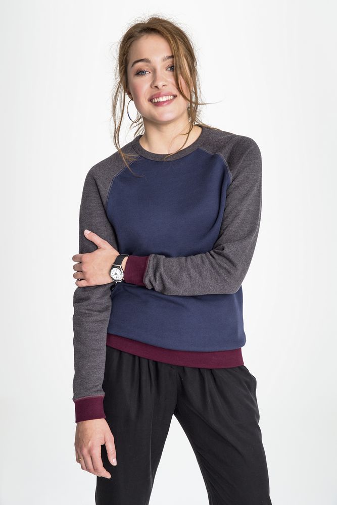 Трехцветный свитшот в стиле 80-х с рукавом реглан. Лейбл производителя в боковом шве изнутри, в шве горловины — только бирка с размером, что позволяет вам нанести свой логотип.