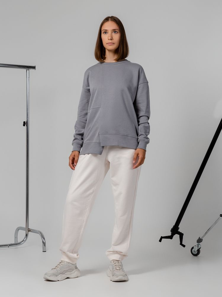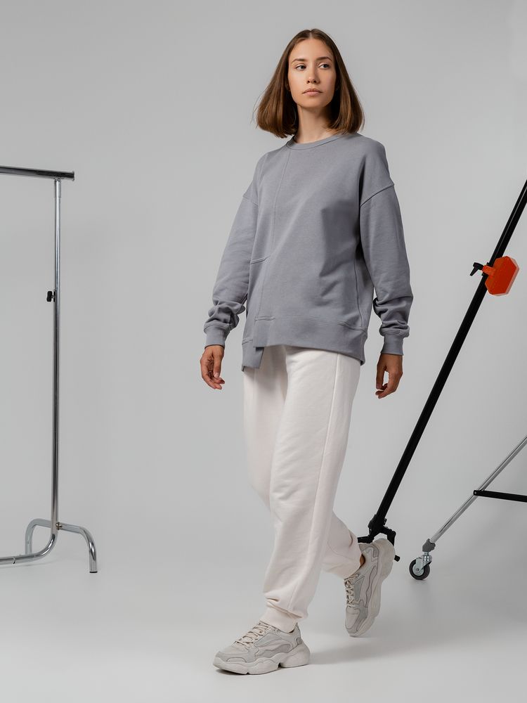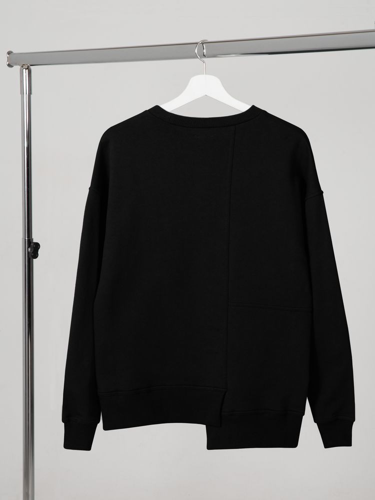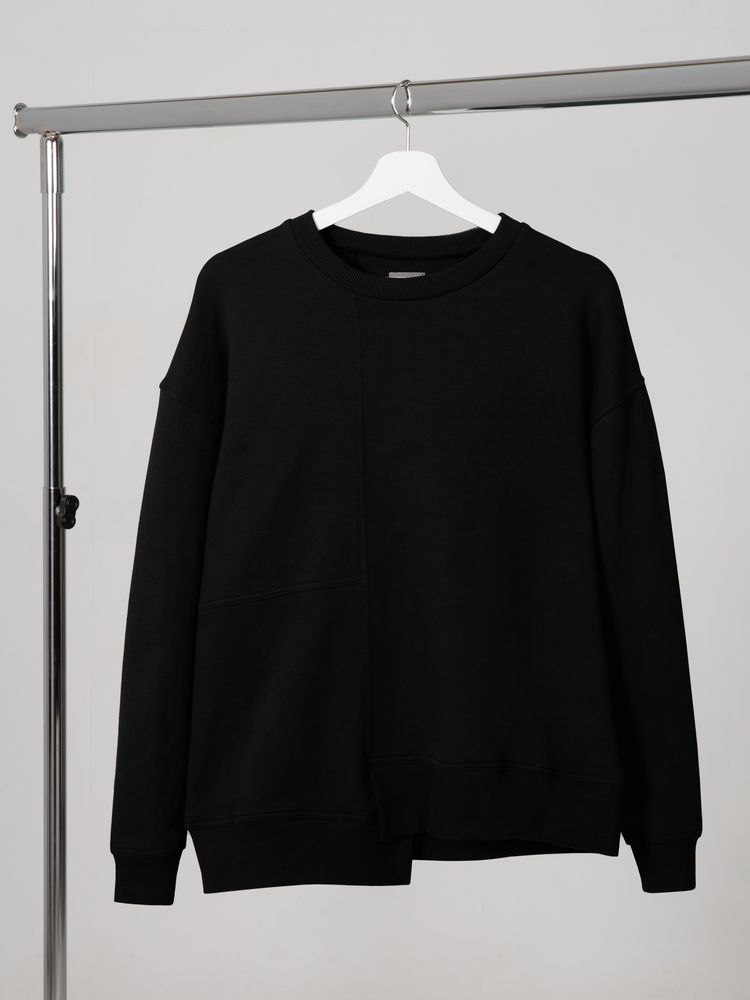 Свитшот унисекс свободного кроя со спущенным плечом и нестандартным нижним краем.