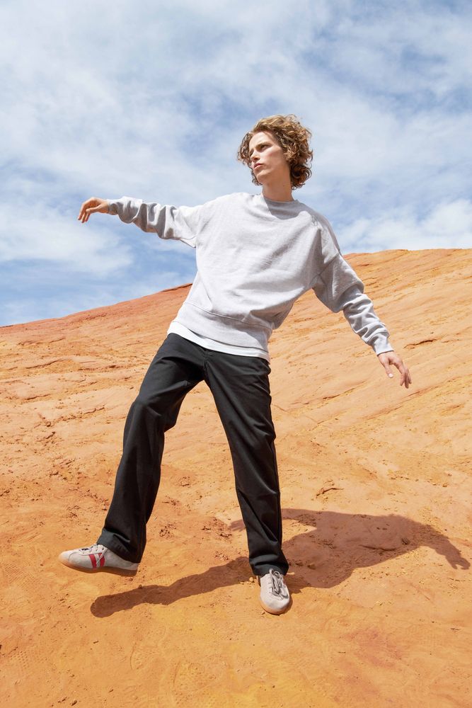 Плотный свитшот унисекс свободного кроя со спущенным плечом и широким поясом.