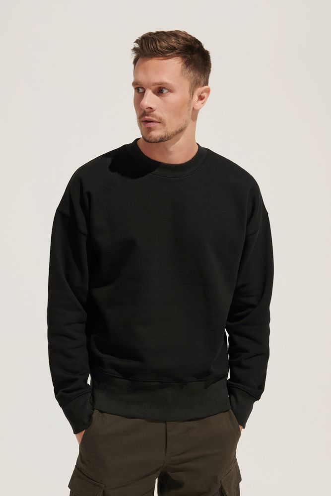 Плотный свитшот унисекс свободного кроя со спущенным плечом и широким поясом.