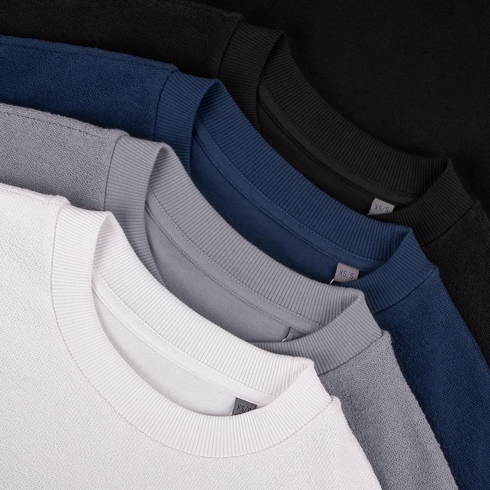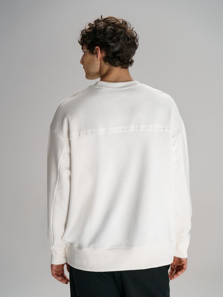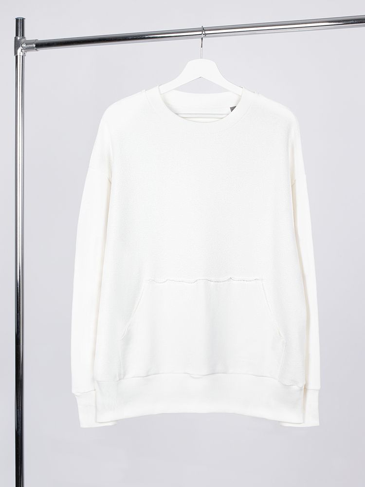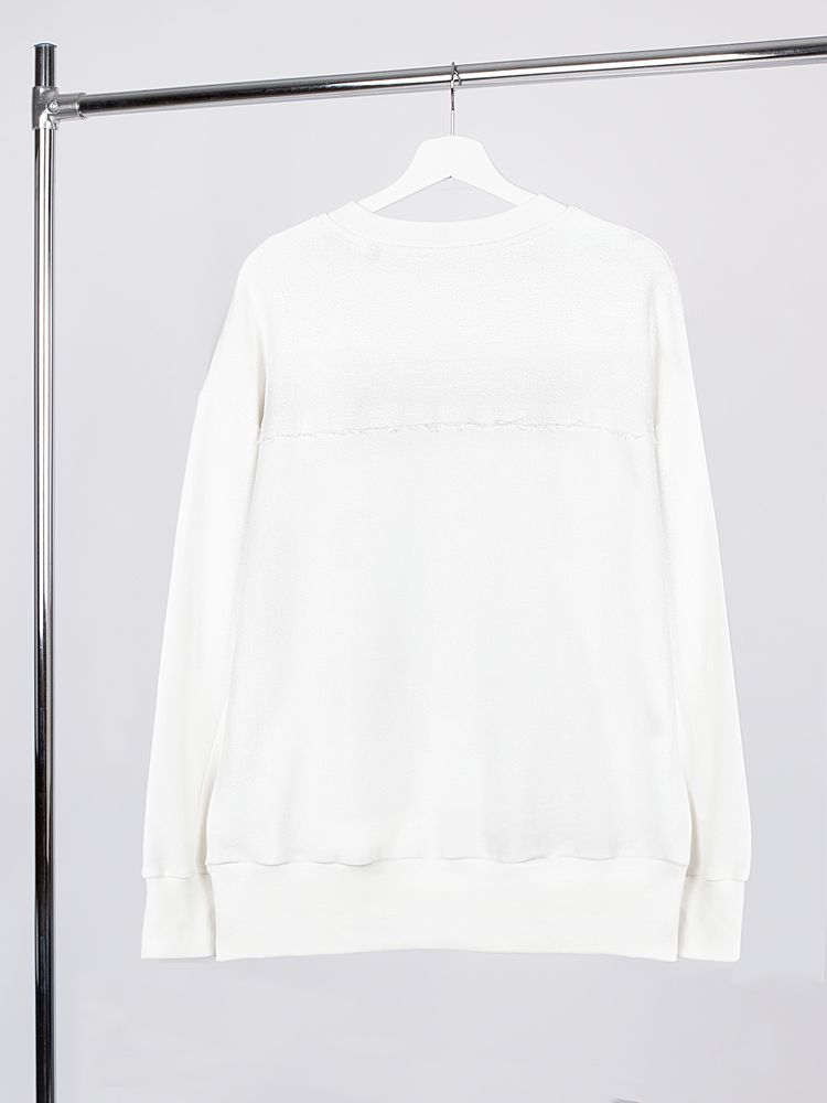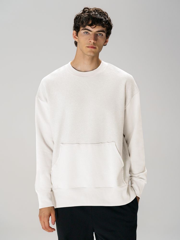 Благодаря особой конструкции, где часть деталей — перед и спинка — вывернута наизнанку, свитшот приобретает запоминающийся вид. Так внутренняя, обычно незаметная сторона материала превращается в лицевую: миниатюрные петельки бывшей изнанки становятся настоящим украшением толстовки, добавляя ей оригинальности и эффект невероятно приятной плюшевости.