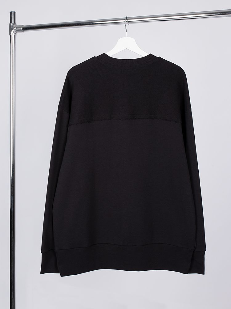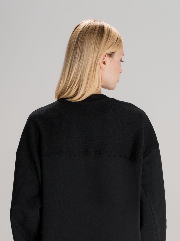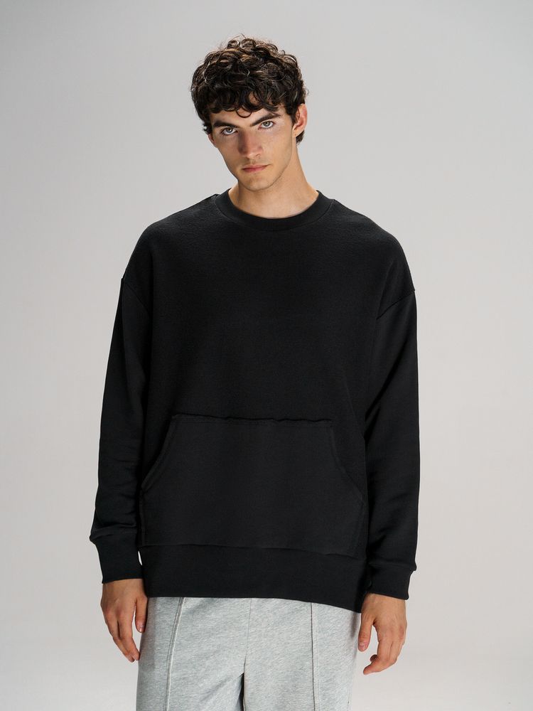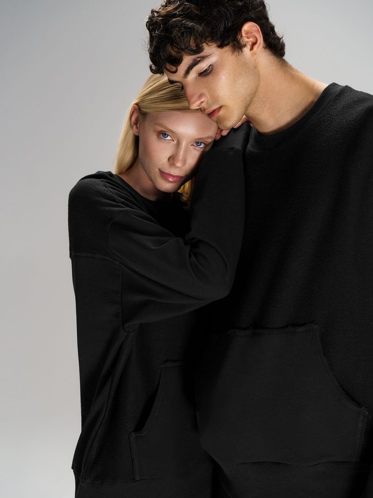 Благодаря особой конструкции, где часть деталей — перед и спинка — вывернута наизнанку, свитшот приобретает запоминающийся вид. Так внутренняя, обычно незаметная сторона материала превращается в лицевую: миниатюрные петельки бывшей изнанки становятся настоящим украшением толстовки, добавляя ей оригинальности и эффект невероятно приятной плюшевости.
