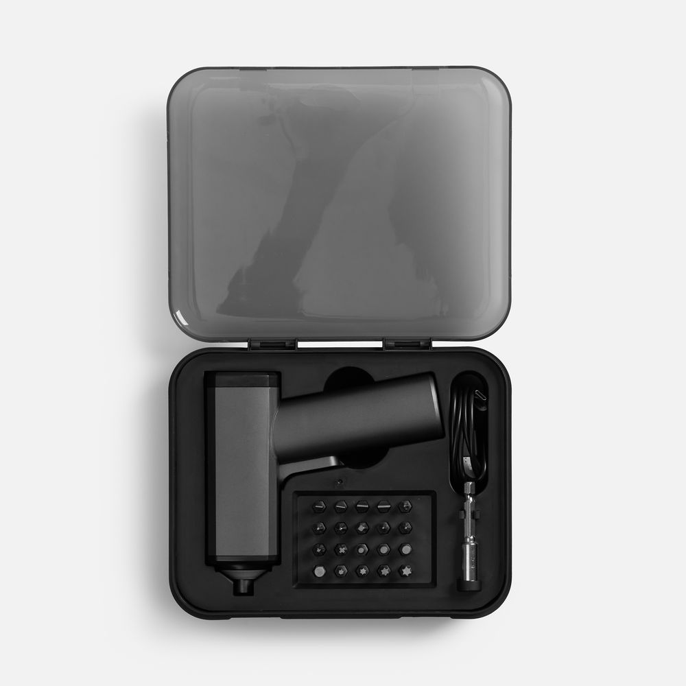 Комплектация: электрическая отвертка, биты (20 шт), удлинитель наконечника, зарядный кабель USB-USB Type-C, бокс для хранения, инструкция.