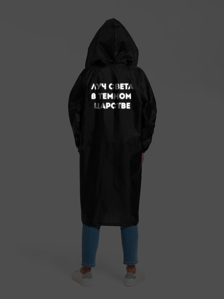 Дождевик для позитивных людей, которые озаряют этот мир своим присутствием! Луч света в темном царстве — светоотражающий принт. Хорошо видимый в темное время, он убережет вашу светлую личность от проблем на дороге. Плащ-дождевик из ткани таффета на молнии с капюшоном. Складывается в мешочек — удобно брать с собой.
