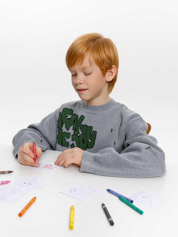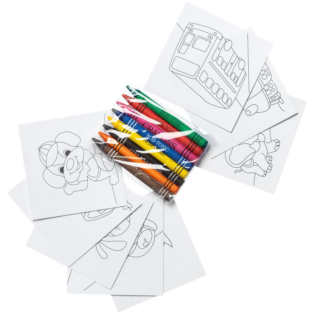 В набор входят 8 картинок для раскрашивания и 8 цветных восковых мелков.