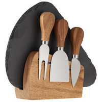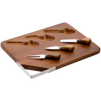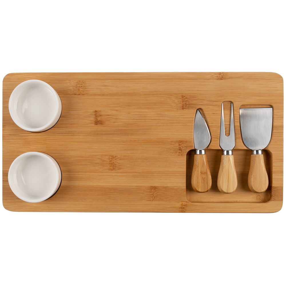 Стильное лаконичное решение для изящной сервировки сырной тарелки. В набор входят доска из бамбука, два керамических соусника, вилка, листовидный нож для сыра твердых сортов, нож-лопатка для мягкого сыра. Емкость соусника 70 мл. Набор поставляется в индивидуальной транспортной упаковке.