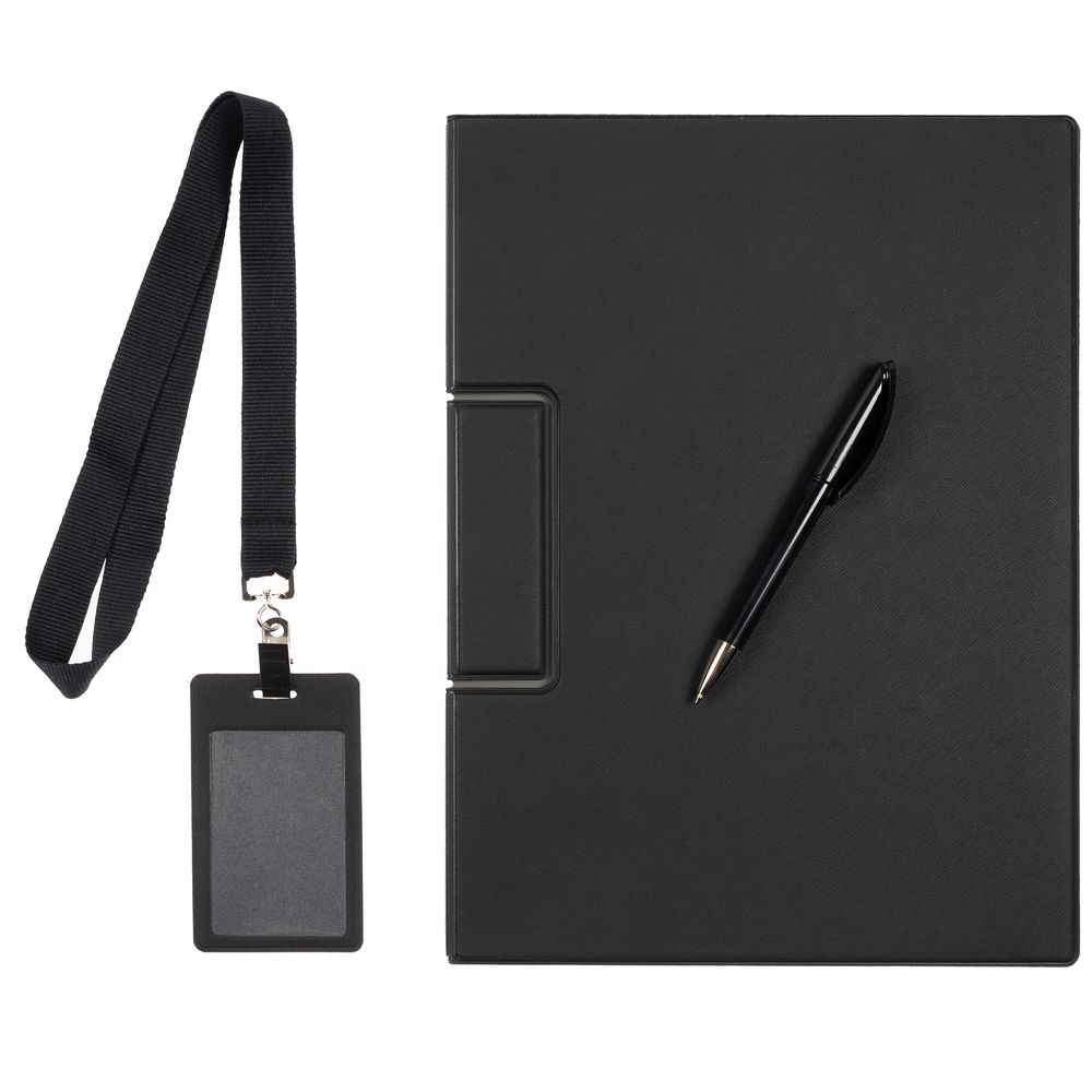 Лаконичный и строгий приветственный набор Devon Span содержит самое необходимое для нового сотрудника или участника профессионального мероприятия. Это папка-планшет и ручка — для комфортных записей и фиксации документов во время деловых переговоров или докладов, а также чехол для пропуска на ленте — для безопасности и идентификации — все в компактной легкой сумке.