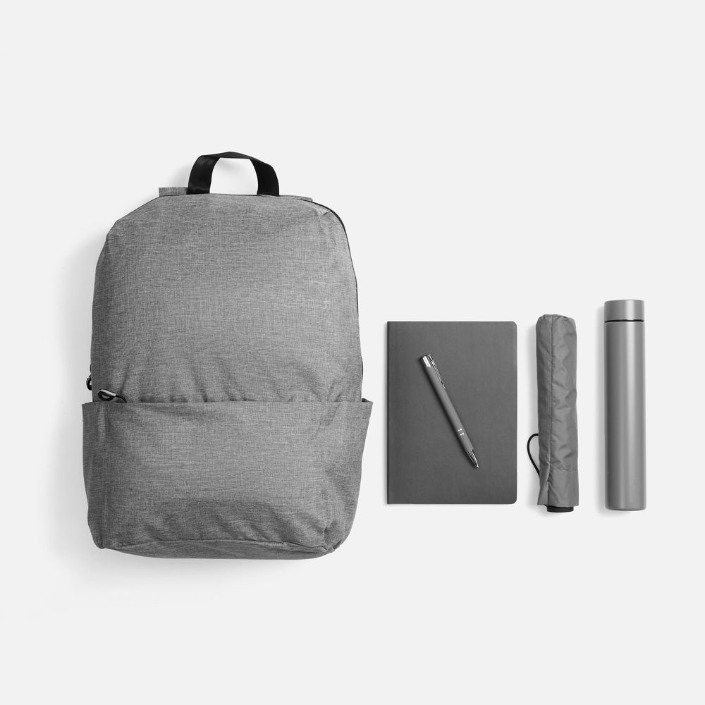 рюкзак: 27x40x14 см; зонт: длина 49 см, диаметр купола 90 см, длина в сложении 22 см; термобутылка: высота 23,5 см, диаметр 4,3 см; блокнот: 15,5х21х1 см; ручка: 13,7х0,8 см