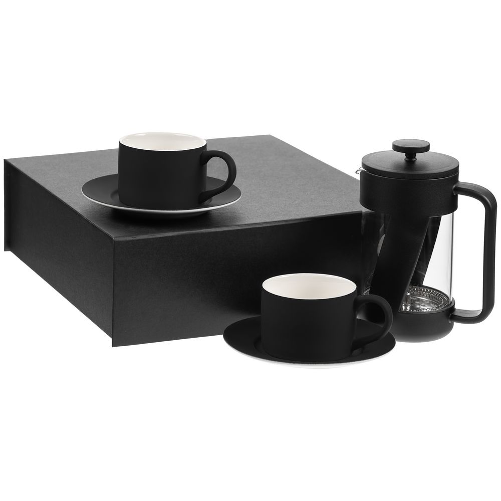 чайная пара - фарфор; покрытие софт-тач; френч-пресс - боросиликатное стекло, пластик, нержавеющая сталь; коробка - переплетный картон