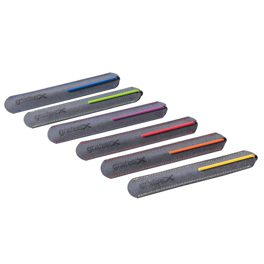 Карандаш Pininfarina GraFeeX с цельным корпусом матового черного цвета, ярким клипом и наконечником из материала GrafeeX, полученного в результате спекания мелких частиц графита при высоких температурах. Этот материал расходуется крайне экономно, при этом след нанесения не отличается от обычного графитного карандаша. В комплект входит элегантный темно-серый чехол, сшитый вручную из рециклированной кожи.