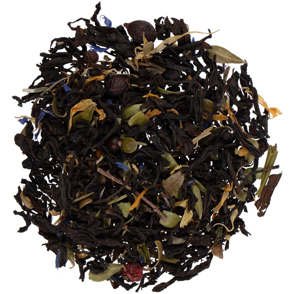 Крупнолистовой индийский чай с ягодами клюквы, смородины и можжевельника, брусничным листом и травами погружает в атмосферу таежного леса, дарит приятное расслабление и создает волшебное настроение.Состав: чай черный крупнолистовой, боярышник, ягоды клюквы, плоды можжевельника, лист брусники, мята, лепестки календулы, лист оливы, лепестки василька, ягоды смородины, пищевой ароматизатор «Черная смородина».