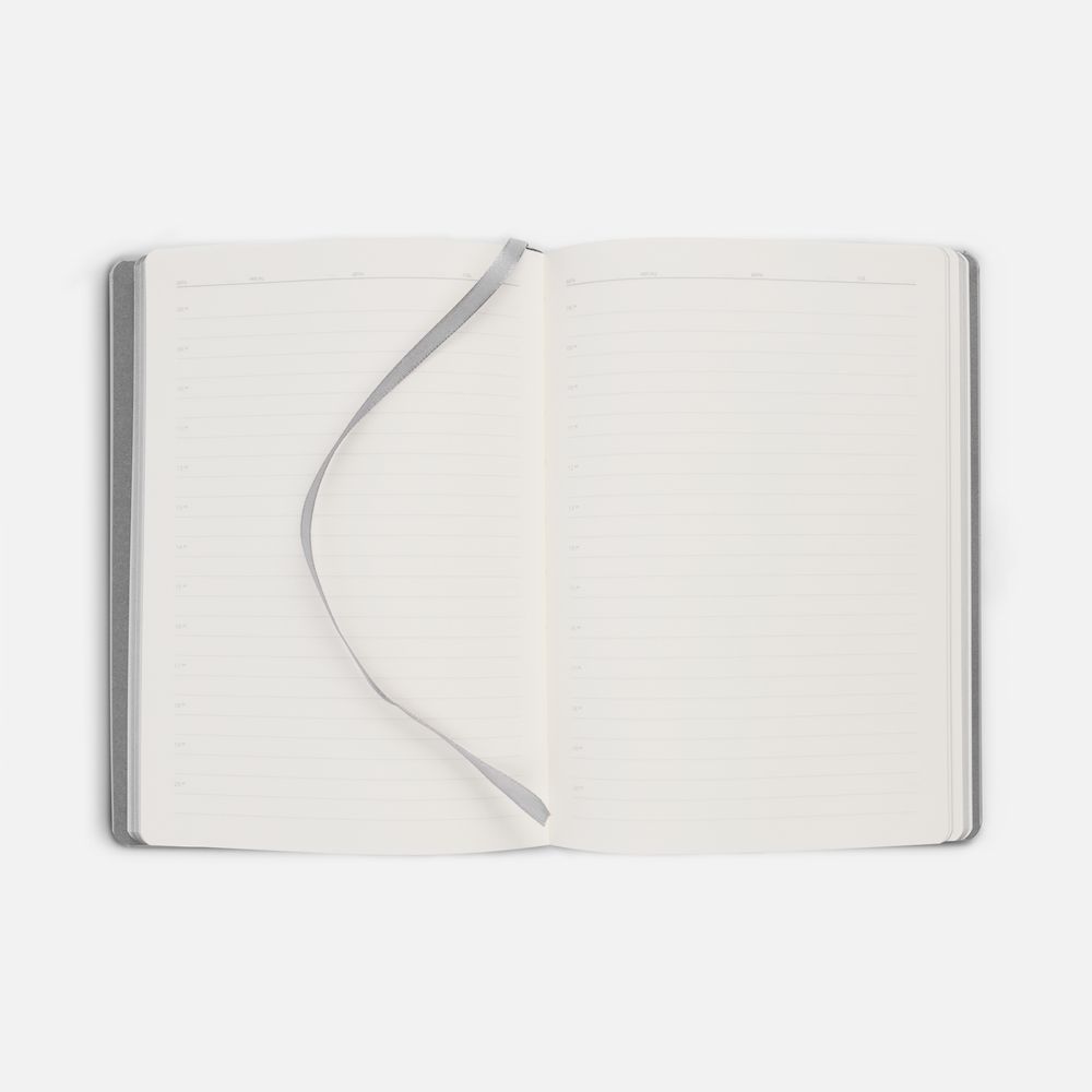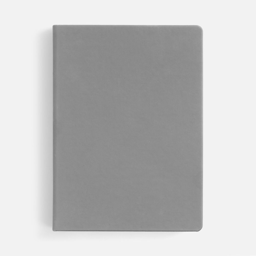 Ежедневник с твердой обложкой и тонированным обрезом, выполнен из материала Soft Touch, серый СС, дополнен ляссе в цвет обложки.