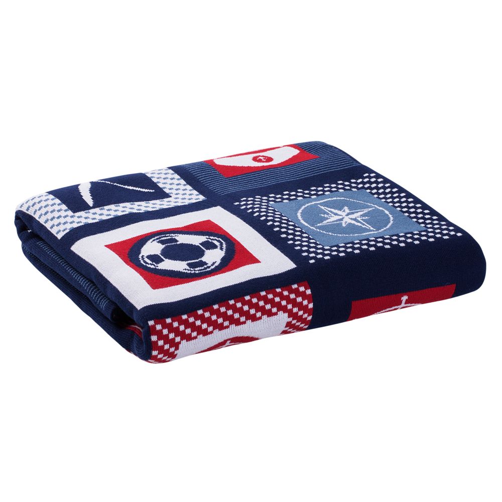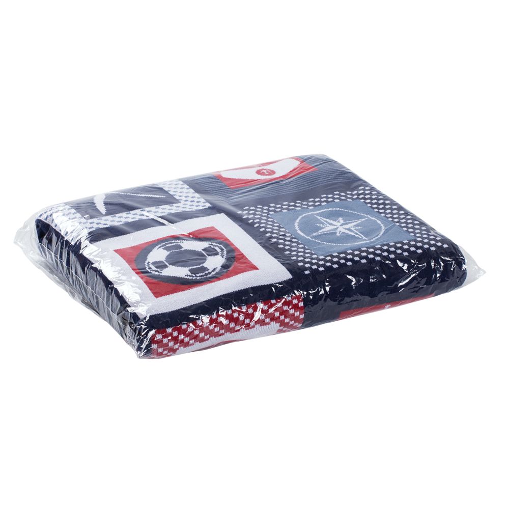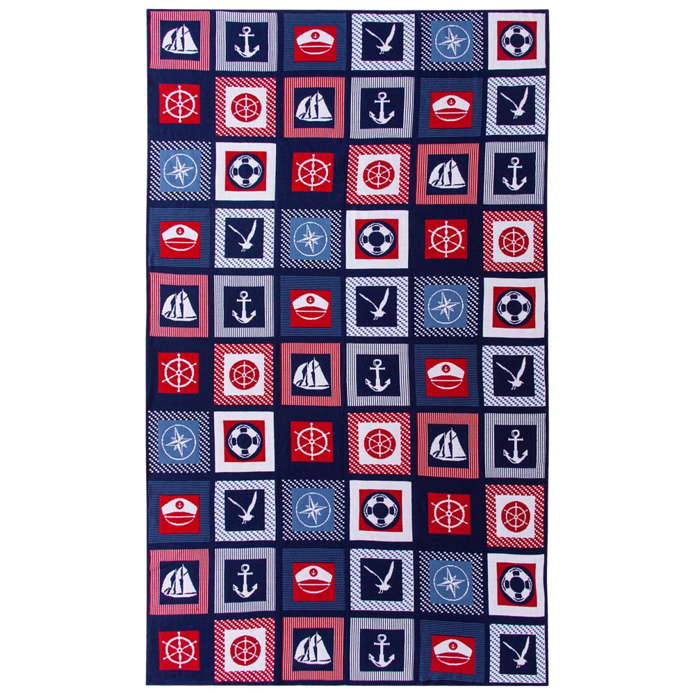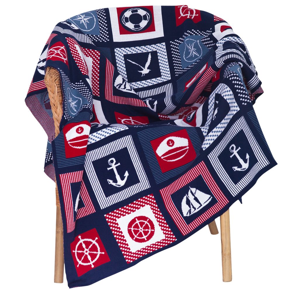 В каждой части общего рисунка жаккардового пледа изображены главные морские символы. Поставляется в пакете с липким краем.